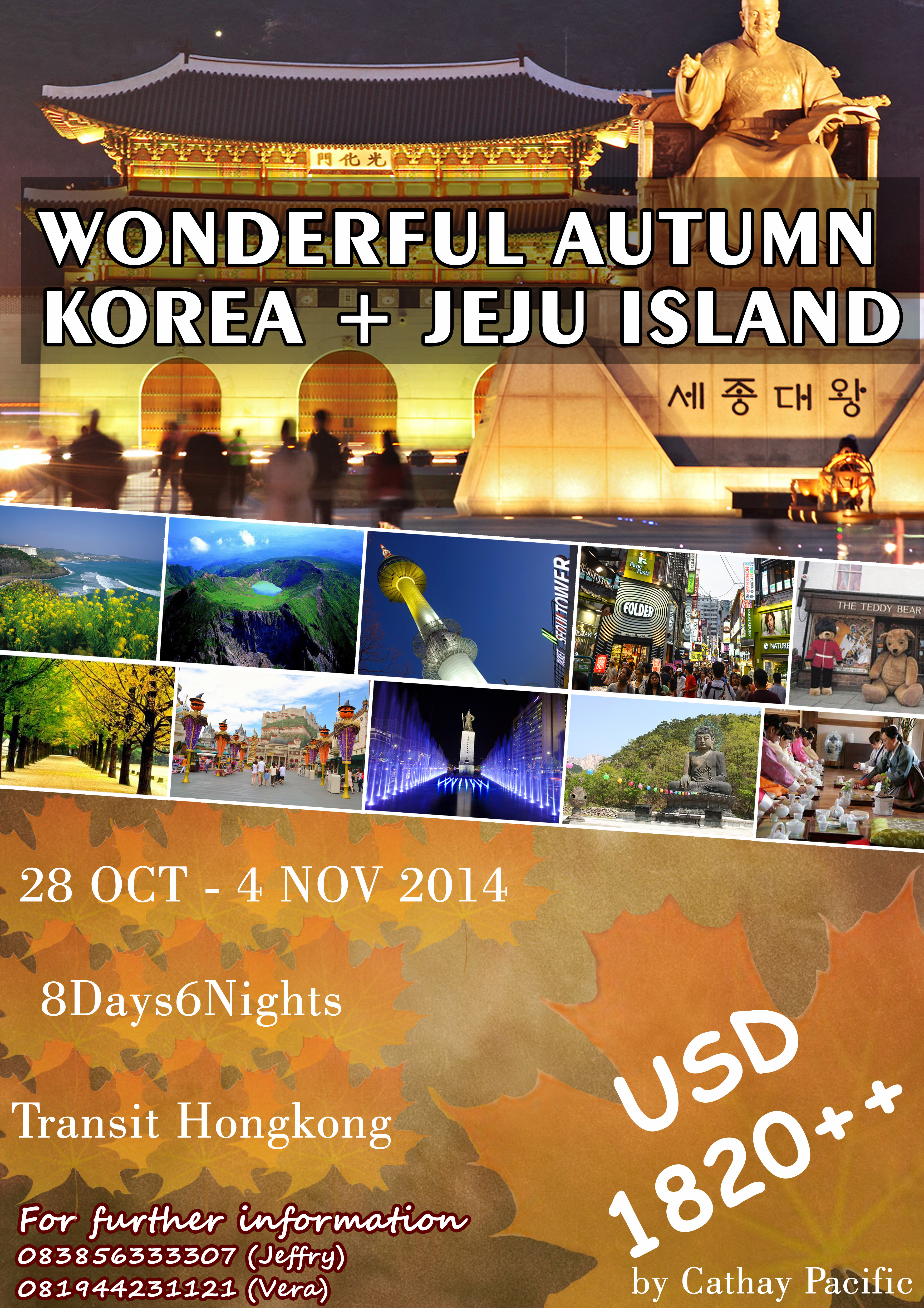 Kegiatan yang diadakan oleh Manajemen Pariwisata UK Petra kali ini adalah “Wonderful Autumn Korea + Jeju Island”. Kegiatan yang dilaksanakan selama 8 hari 6 malam ini dikenakan biaya sebesar $ 1.820++. Untuk informasi lebih lanjut dapat menghubungi Jeffry (083856333307) atau Vera (081944231121).