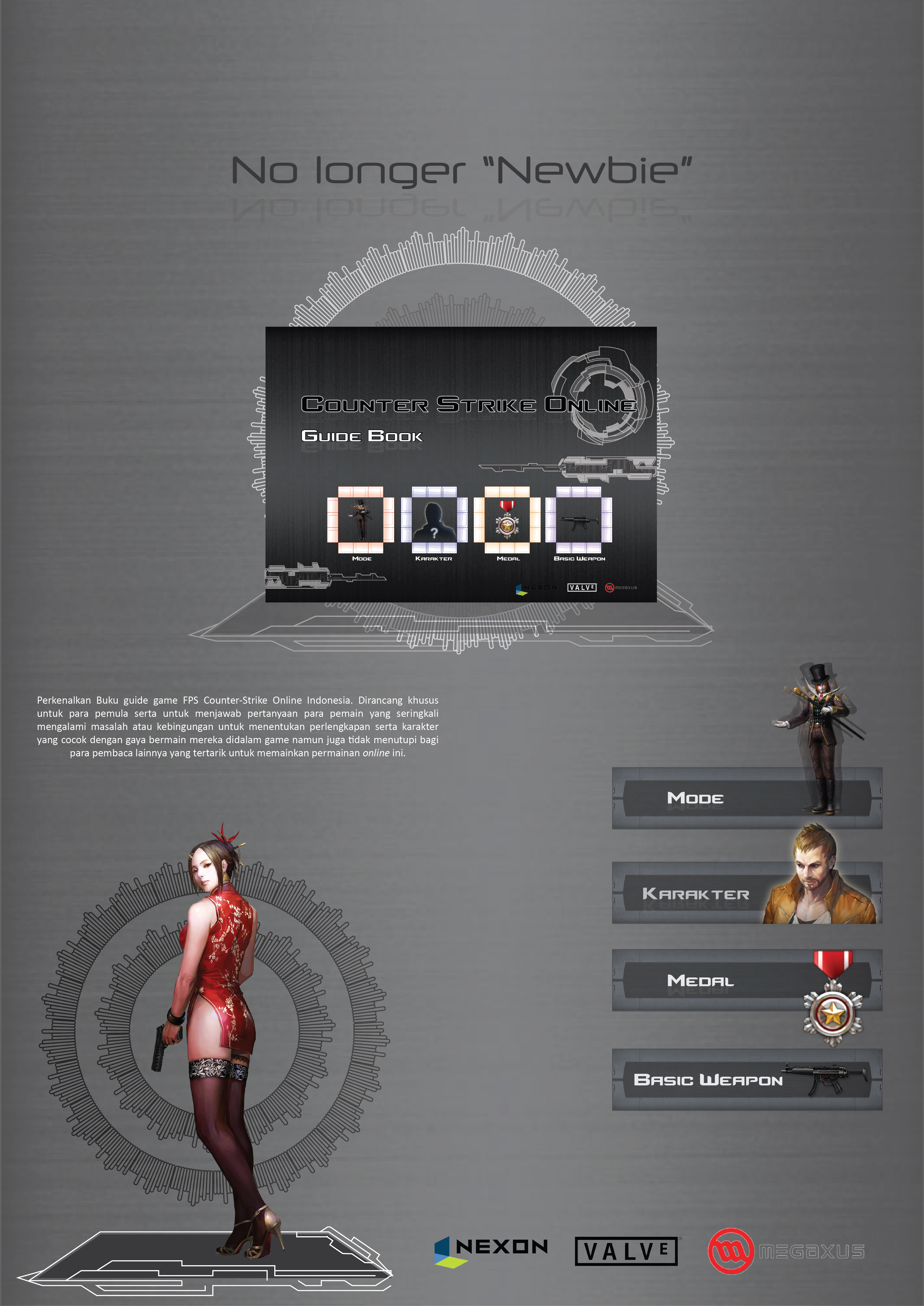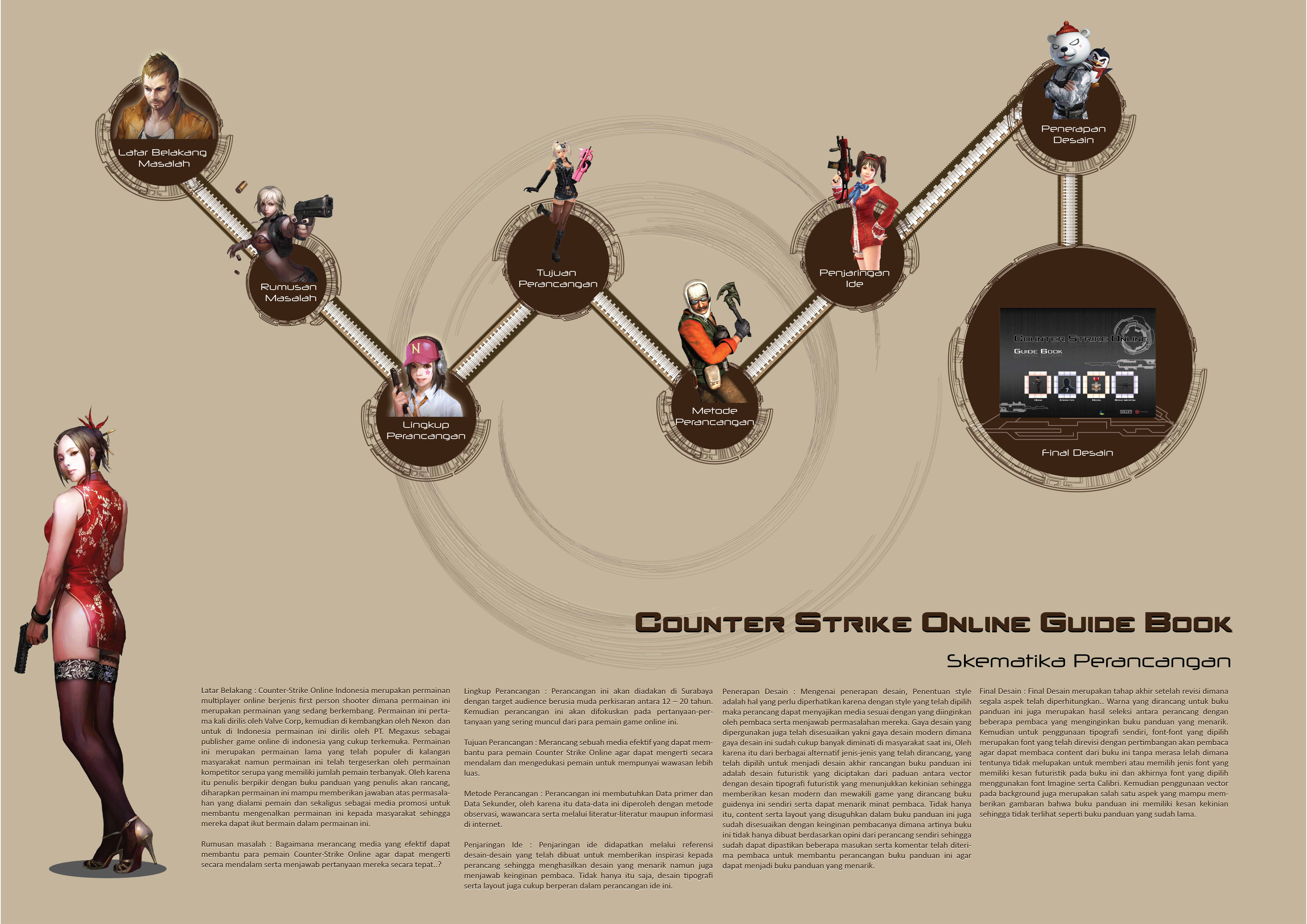 Counter-Strike Online Indonesia merupakan permainan multiplayer online berjenis first person shooter di mana permainan ini merupakan permainan yang sedang berkembang. Permainan ini pertama kali dirilis oleh Valve Corp, kemudian di kembangkan oleh Nexon dan untuk di Indonesia permainan ini dirilis oleh PT Megaxus sebagai publisher game online di Indonesia yang cukup terkemuka. Meskipun permainan ini cukup digemari di masyarakat, permainan ini masih kalah dengan permainan kompetitor dan juga para pemain yang sedang memainkan permainan ini juga mengalami permasalahan untuk mengenal apa saja yang perlu diketahui dalamnya sehingga atas pemikiran inilah, strategi kreatif diperlukan dalam perancangan ini demi mengetahui konsep warna, tipografi, serta data-data yang didapatkan dalam permainan serta dari sinilah dirancang sebuah buku panduan yang mampu menjawab permasalahan para pemain sekaligus mempromosikan permainan ini kepada khalayak.
