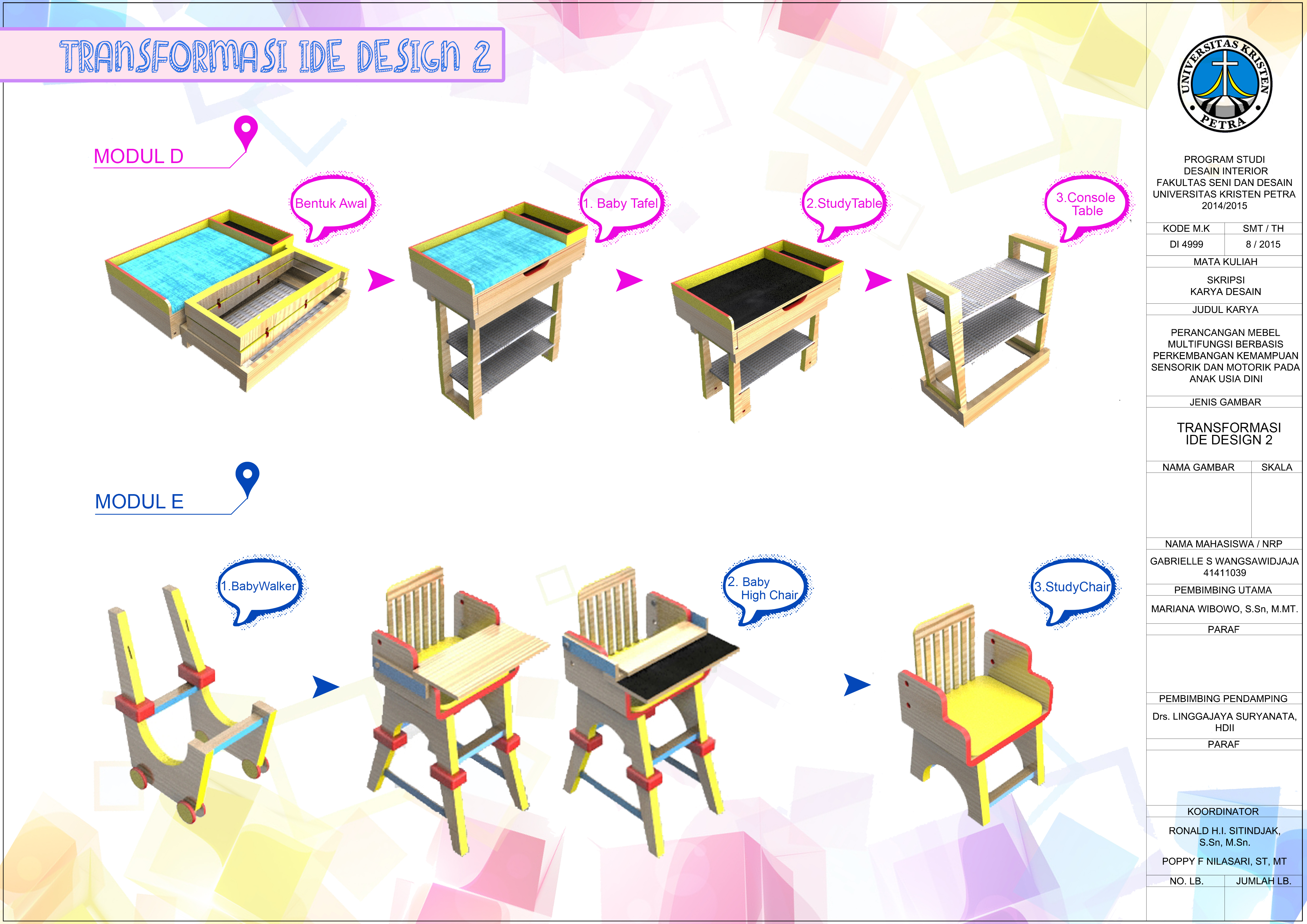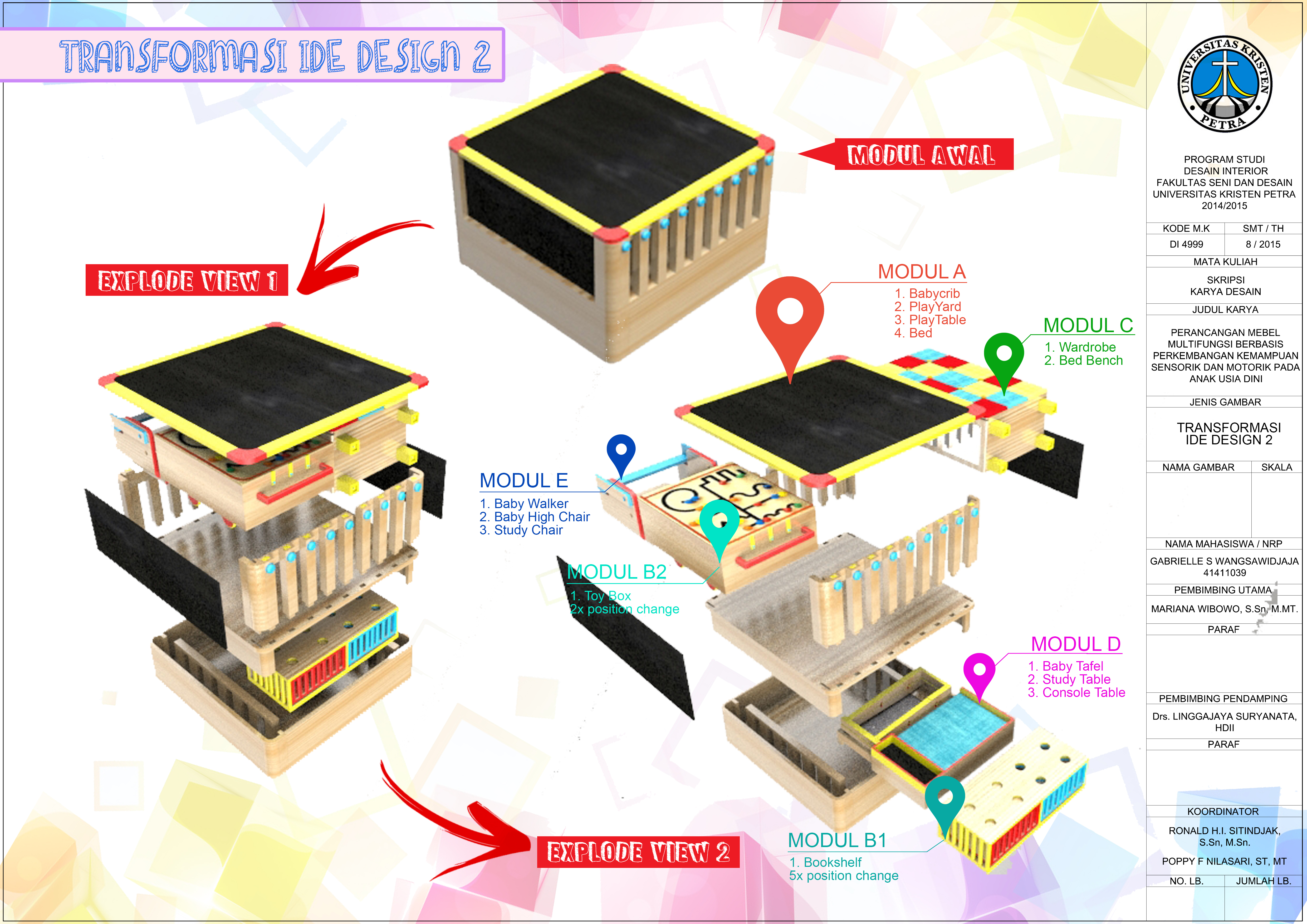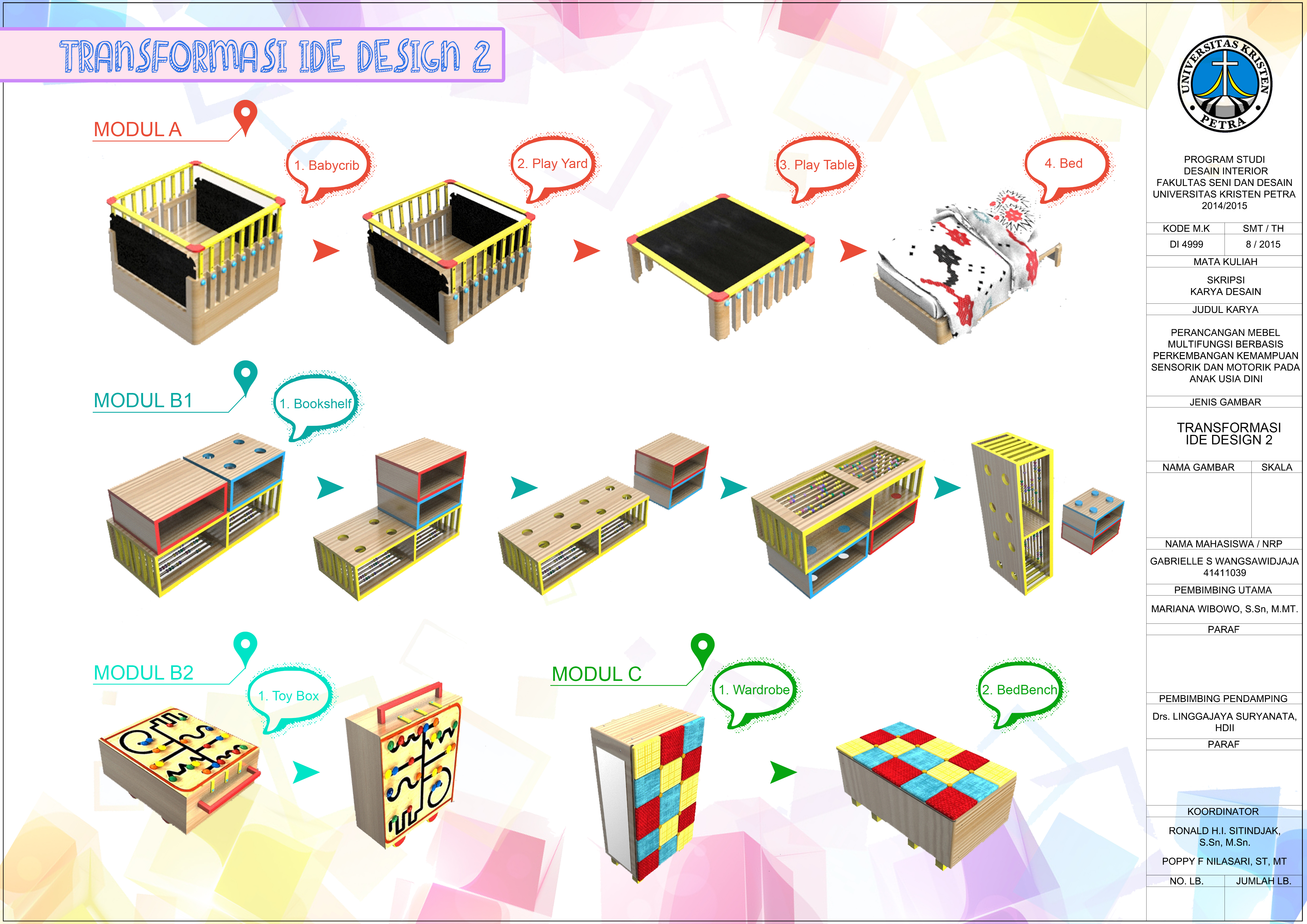Perubahan pola huni diakibatkan pertumbuhan jumlah penduduk yang tinggi, mengakibatkan penghuni memilih hunian yang lebih compact, yaitu apartemen. Namun, perlu disadari, anak dalam rentang umur nol hingga tujuh tahun membutuhkan stimulasi agar pertumbuhan kemampuan sensorik dan motorik menjadi maksimal. Minimnya ketersediaan ruang di dalam hunian untuk memenuhi kebutuhan tersebut dapat diselesaikan melalui mebel multifungsi. Menggunakan apartemen The Voila sebagai objek desain, dilakukan pengumpulan data melalui wawancara, kuesioner, serta studi literatur yang akan digunakan sebagai basis analisa. Melalui analisa programming, diangkatlah konsep Fun in Function. Konsep ini menggabungkan sebuah proses learning through play yang dibutuhkan dalam perkembangan psikomotor, kognitif serta fisik anak dengan fungsi mebel yang secara utuh mendukung aktifitas anak-anak melalui mebel yang aman, mudah, kuat, multifungsi sehingga dapat dipakai dalam jangka waktu yang lama. Ide desain yang dipilih memiliki bentuk modul awal berbentuk kotak berukuran 1000 x 1000 x 620 mm, di mana kemudian dipecah menjadi lima modul, yang dapat menghasilkan lima belas fungsi mebel yang memiliki fitur permainan sebagai stimuli perkembangan sensorik dan motorik.