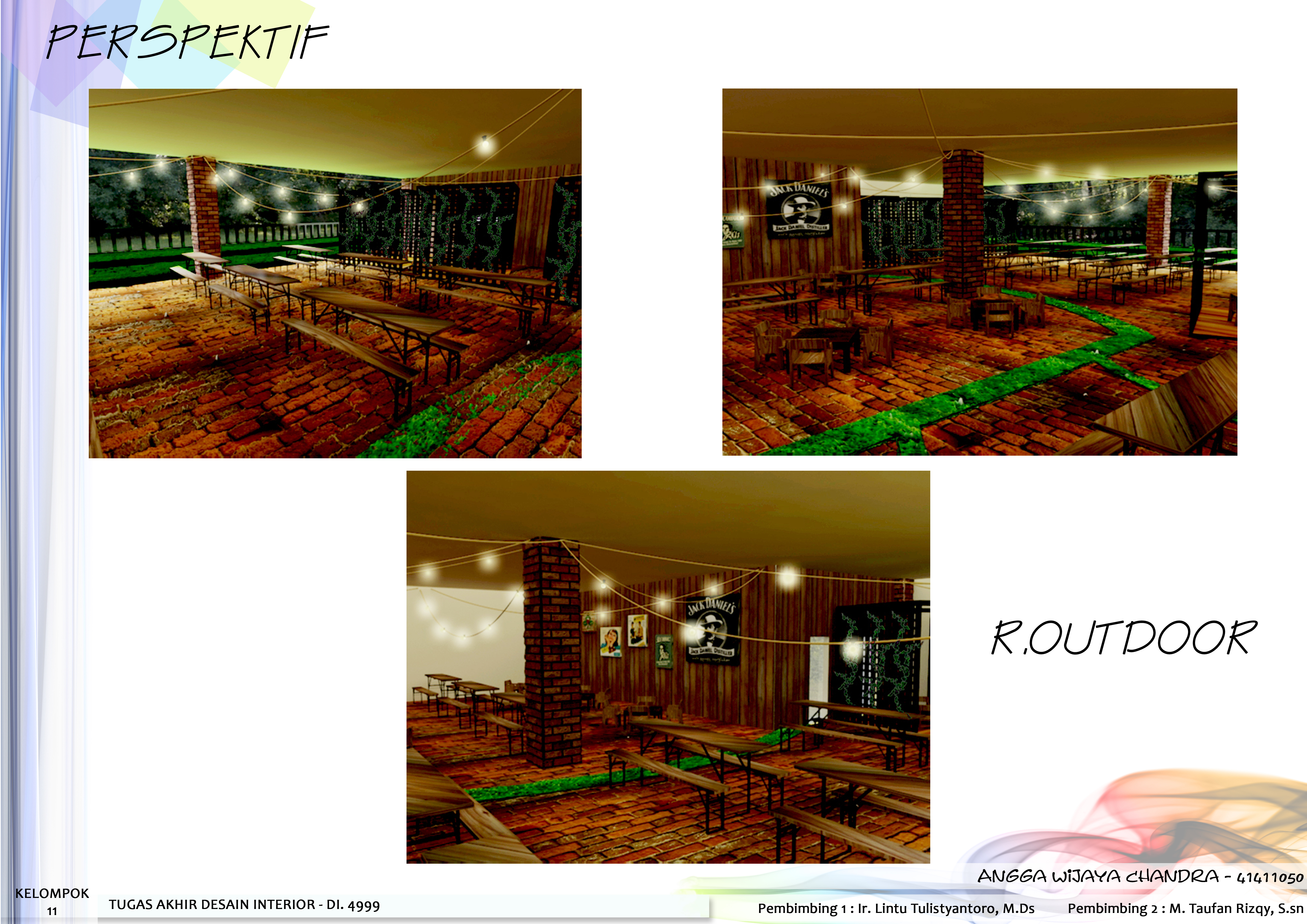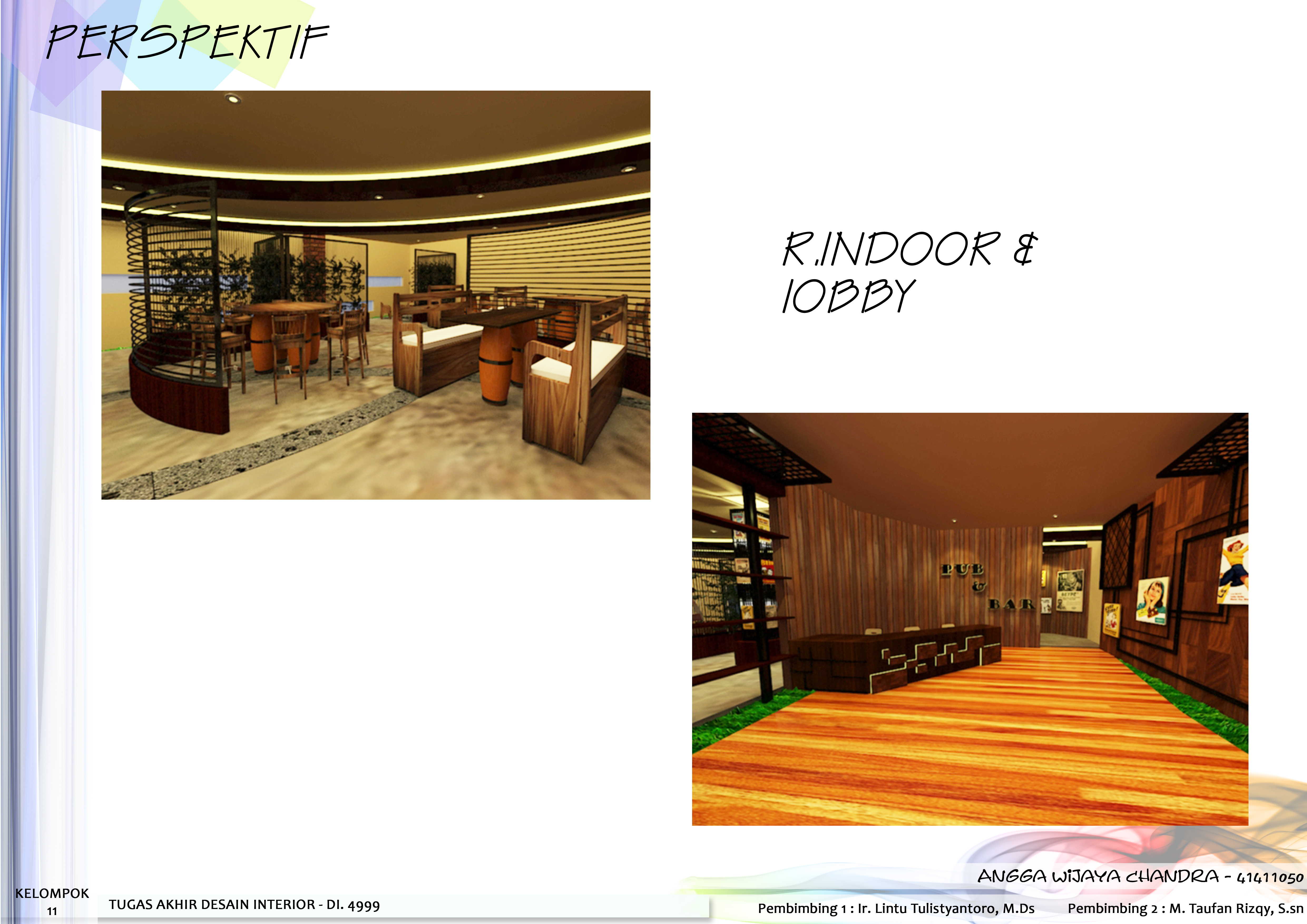 Bisnis Pub & Bar adalah bisnis yang menjual suasana yang nyaman untuk bersantai maupun bersosialisasi Pub & Bar juga sering dijadikan sebagai tempat berkumpul atau bersosialisasi serta menjamu rekan bisnis, akan tetapi pub dan bar di Indonesia belum dapat di gunakan untuk menampung kegiatan untuk mewadahi aktivitas bisnis, dengan konsep “Hamony in Diversity” desain interior pub dan bar dibuat sesuai dengan tema dan kebutuhan masalah yang ada, tidak hanya untuk bersosialisasi tetapi dirancang untuk mewadahi aktivitas bisnis. Desain Interior yang diterapkan di pub dan bar dibuat berdasarkan kebutuhan pemakainya sehingga untuk memberikan space untuk menampung kegiatan bisnis di buat semi private space.