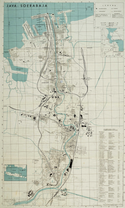 Legenda di sebelah kanan bawah mencantumkan bangunan bangunan penting di Surabaya dengan fungsinya. Dengan peta ini di tangan kita, kita bisa membayangkan diri sebagai personel Sekutu di ruang perang mereka dan mengantisipasi saat masuknya sekutu di Surabaya.