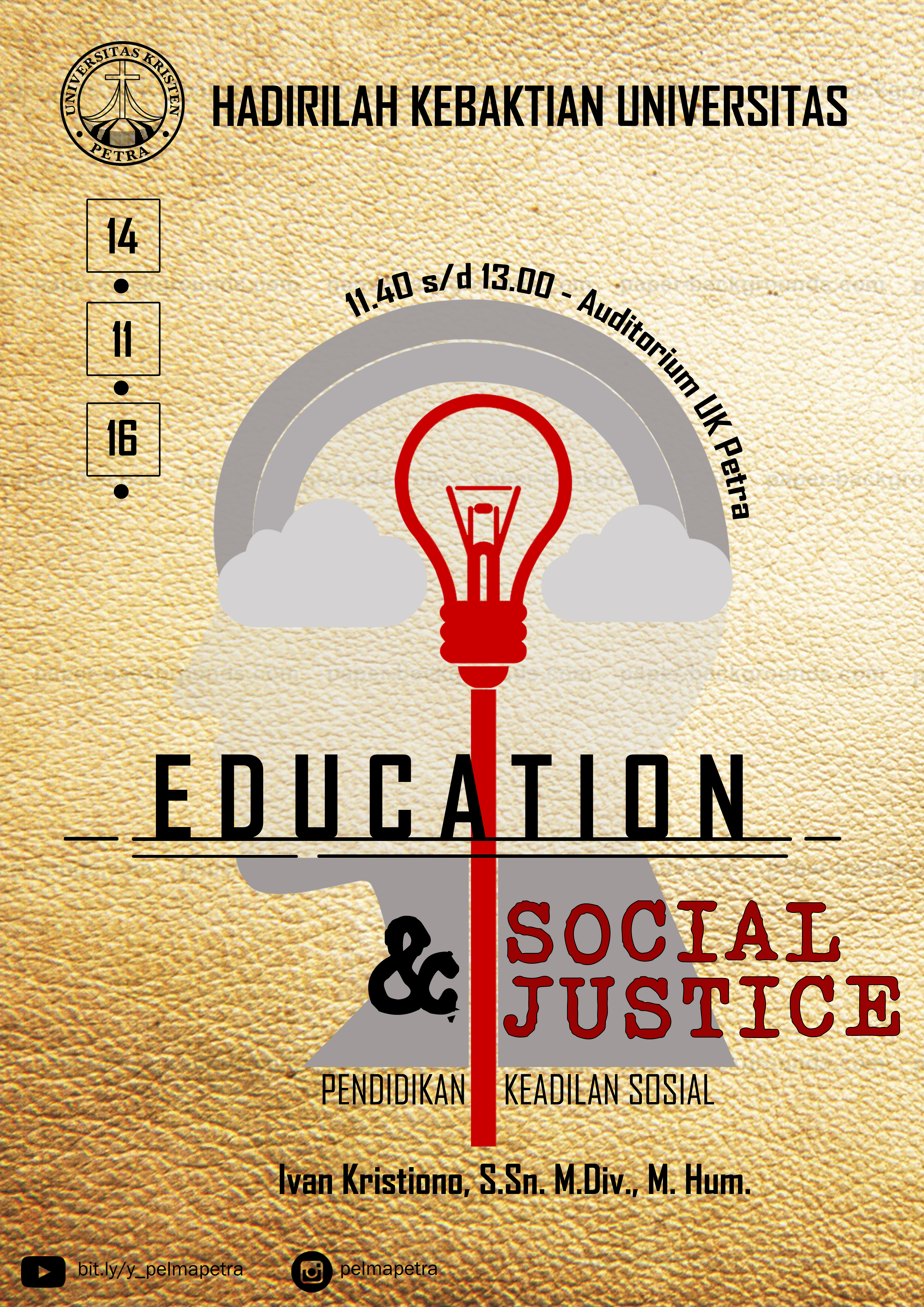 Kebaktian universitas setiap hari Senin diadakan pada tanggal 14 November 2016, dengan mendatangkan Ivan Kristiono sebagai pembicara. Dengan mengangkat tema "Education and social justice" kebaktian diadakan di Auditorium UK Petra.