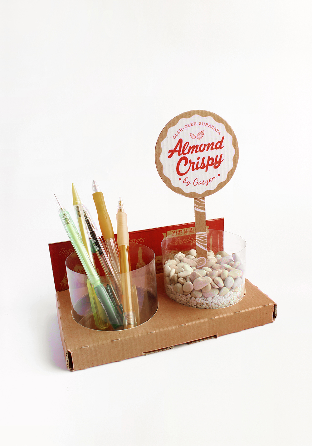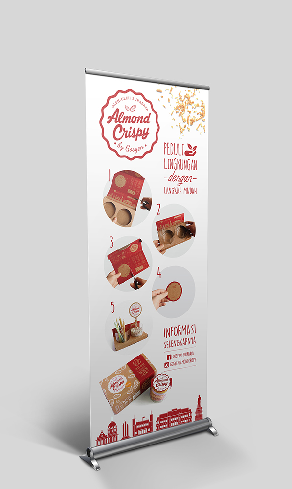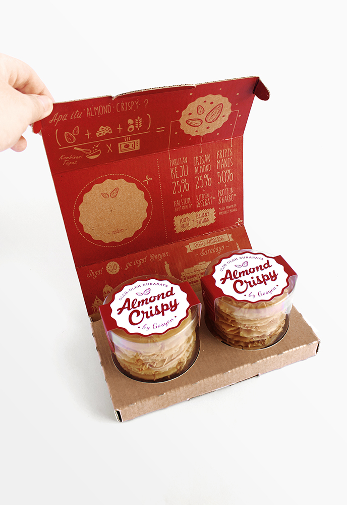 Gosyen adalah produsen roti dan kue di Surabaya yang berdiri sejak tahun 2003. Di tahun 2012 Gosyen memutuskan untuk menciptakan produk baru dengan nama Almond Crispy Cheese untuk oleh-oleh khas Surabaya. Kelemahan produk terletak pada positioning yang kurang tepat, baik itu segmen pasar yang dituju, maupun desain kemasan yang dinilai kurang memiliki identitas. Mengingat di era pasar persaingan modern, sebuah produk dituntut untuk dapat menjual produk mereka sendiri lewat identitas merek yang ditonjolkan, salah satunya kemasan. Begitu pula dengan prinsip sustainable pada kemasan yang tidak boleh dilupakan. Oleh karena itu, penting untuk melakukan perancangan desain kemasan Almond Crispy Cheese merek Gosyen yang didasarkan pada riset pasar/konsumen, isu yang sedang berlangsung, hingga mempelajari kelemahan dari kemasan sebelumnya. Dari keseluruhan data yang diolah, dibuatlah desain kemasan Almond Crispy Cheese merek Gosyen untuk memperkuat positioning dan identitas produk sebagai oleh-oleh khas Surabaya, serta prinsip sustainable yang mendukung keberlangsungan kemasan bagi lingkungan sekitar.