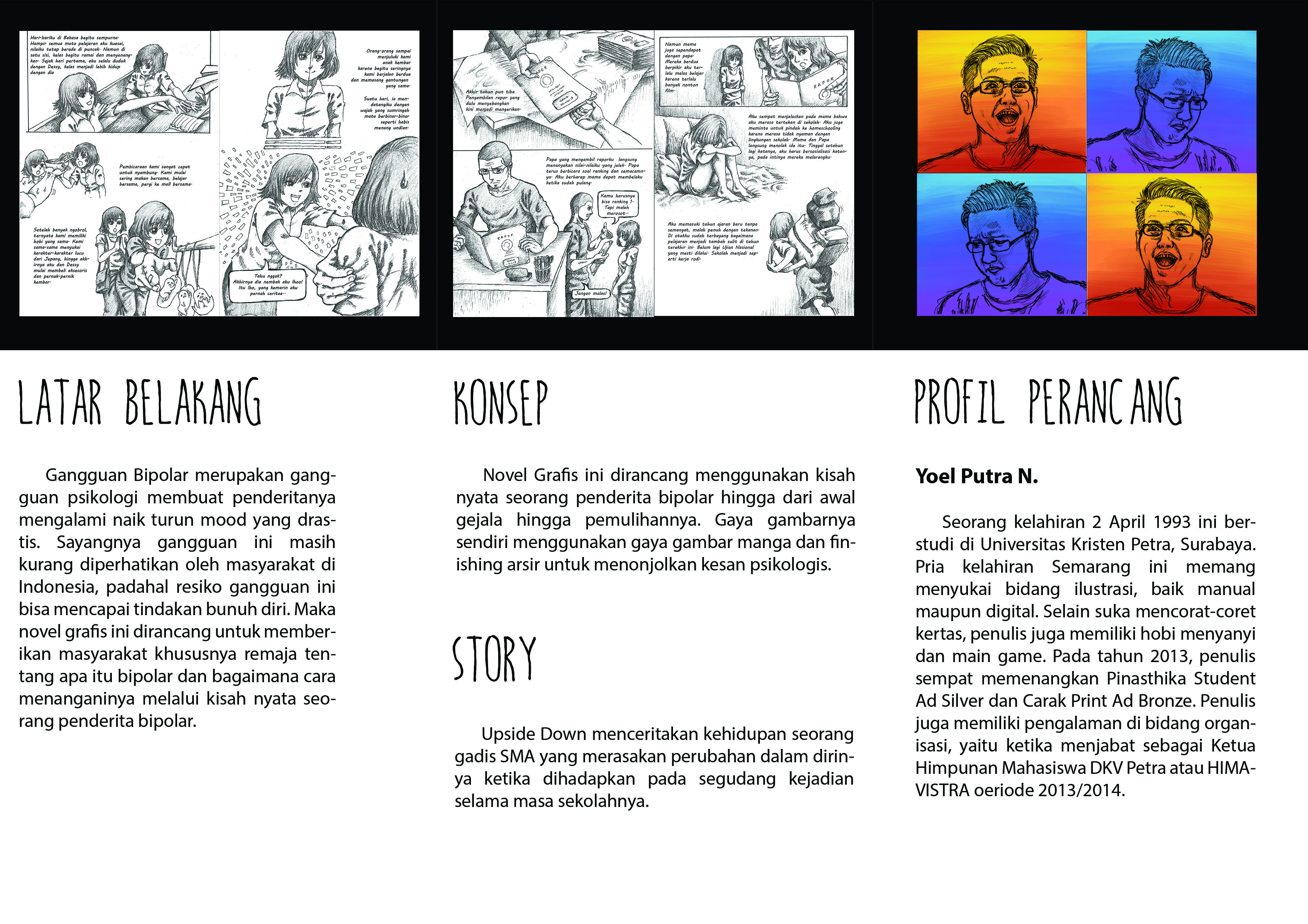 Gangguan bipolar adalah gangguan psikologis yang mengakibatkan naik turun mood secara drastis dan bisa berakibat fatal jika dibiarkan begitu saja. Namun gangguan ini masih kurang dikenal dan diwaspadai oleh masyarakat di Indonesia karena gejalanya yang tidak mencolok. Perancangan novel grafis ini dibuat untuk menginformasikan kepada masyarakat tentang gangguan bipolar serta cara menanganinya. Novel grafis ini dibuat berdasarkan kisah nyata seorang remaja penderita bipolar dari awal gejala hingga pemulihannya. Selain cerita, novel grafis ini juga dilengkapi dengan informasi detail mengenai gangguan bipolar sehingga hasil perancangan ini dapat digunakan sebagai buku panduan baik oleh penderita bipolar maupun orang yang mendampingi penderita. Novel grafis ini menggabungkan gaya komik yang masih menggunakan sistem panneling dengan gaya orisinil yang menggunakan arsiran pensil dan menghasilkan gaya yang unik dan khas.