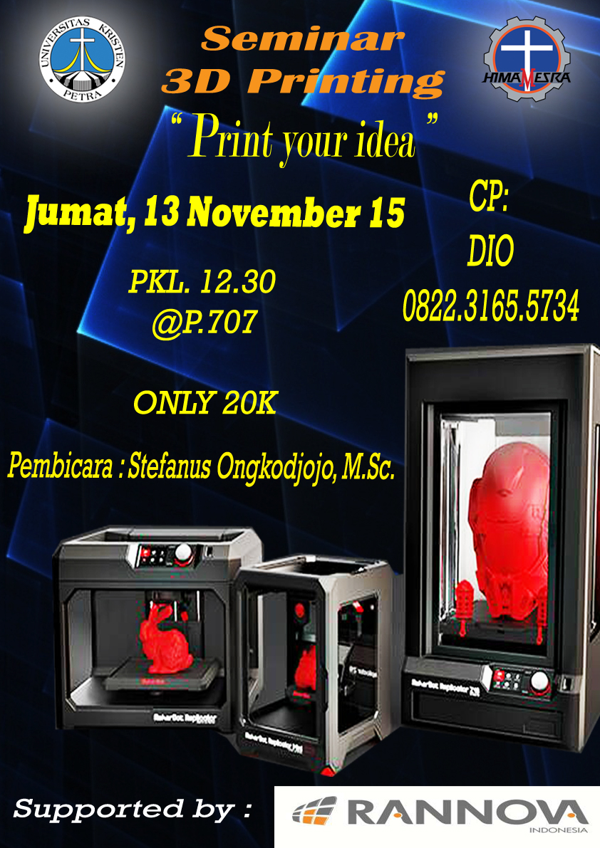 Seminar 3D Printing “Print your idea”, adalah kegiatan yang diselenggarakan Program Studi Teknik Mesin UK Petra. Kegiatan seminar dilaksanakan pada hari Jumat, 13 November 2015 pada pukul 12.30 WIB bertempat di gedung P lantai 7 di ruang P707. Seminar ini mengundang bapak Stefanus Ongkodjojo, M.Sc sebagai pembicara.
