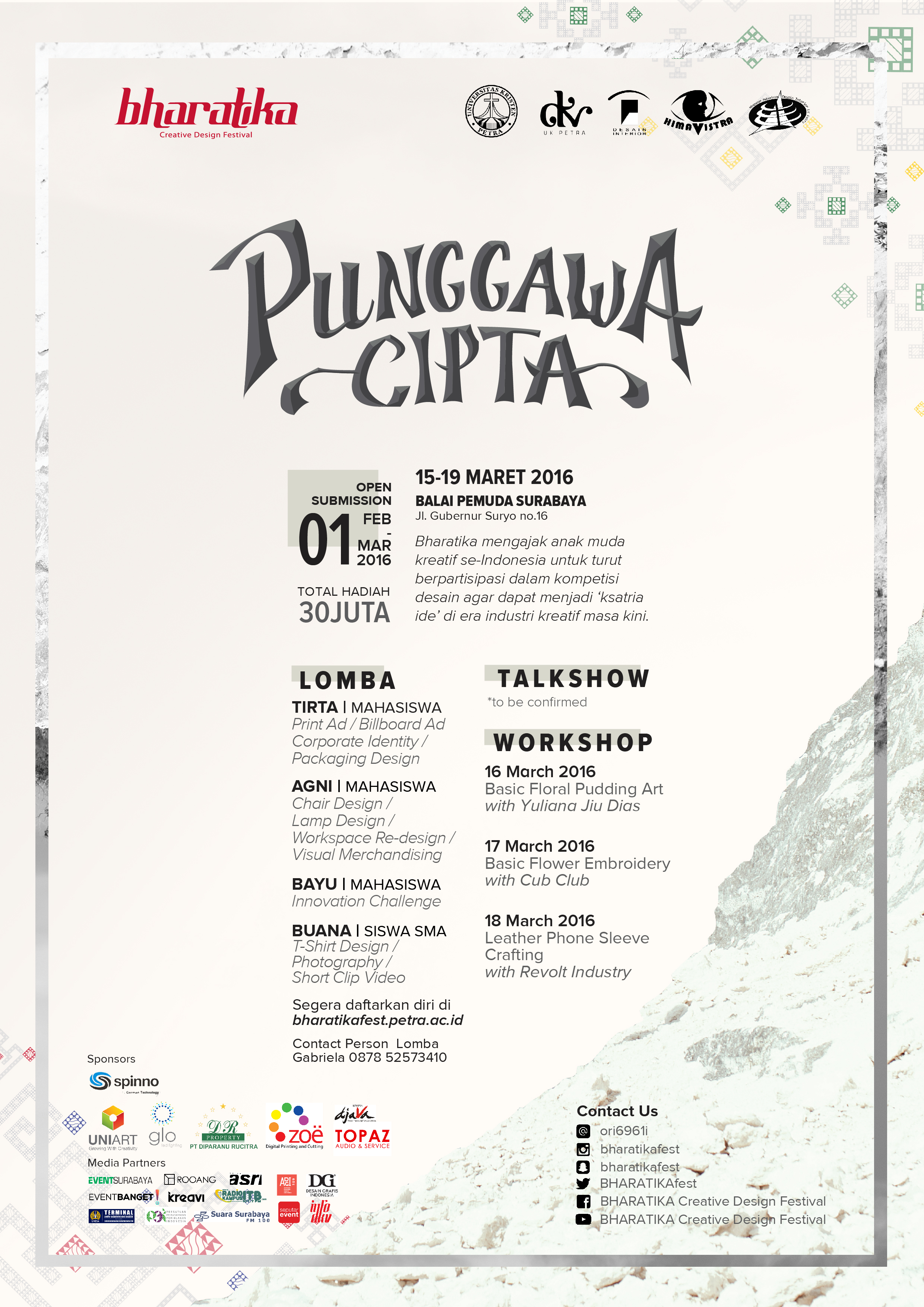 Jurusan desain Interior Universitas Kristen Petra Surabaya mengadakan acara dengan tema Punggawa Cipta. Acara ini meliputi beberapa rangkaian acara yaitu lomba desain dengan total hadiah 30 juta rupiah, talkshow, dan workshop. Kegiatan ini diadakan pada 15-19 Maret 2016 di Balai Pemuda Surabaya.