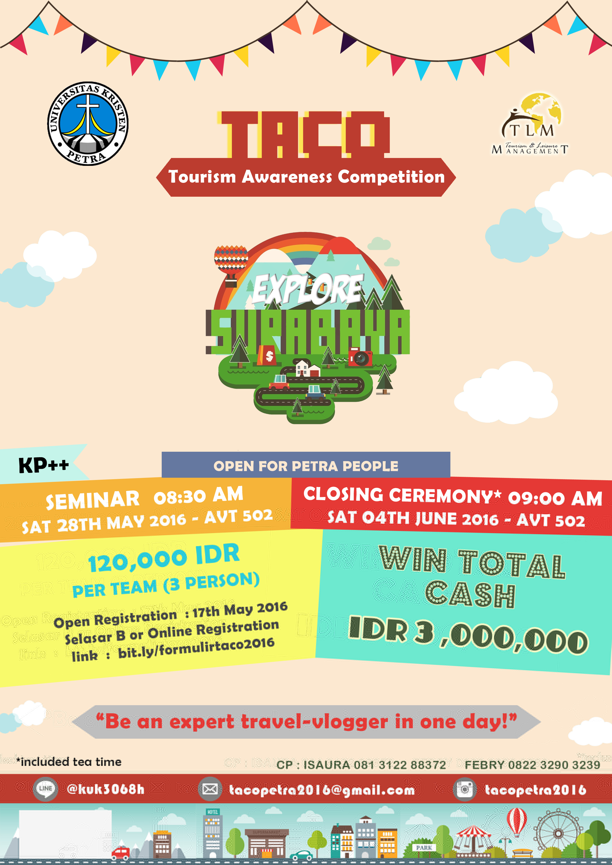 TACO (Tourism Awareness Competition) dengan tema Explore Surabaya diadakan oleh Manajemen Kepariwisataan. Serangkaian acara dilaksanakan, seperti acara seminar yang diadakan pada tanggal 28 Mei 2016 dan penutupan acara pada 4 Juni 2016. Bertempat di Gedung AV.T.502.