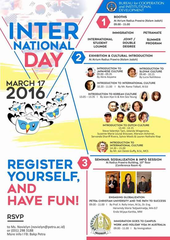 Biro Administrasi kerjasama dan pengembangan UK Petra mengadakan acara "International Day 2016", pada tanggal 17 Maret 2016. Pameran studi beberapa kampus yang terjalin kerjasama dengan UK Petra diadakan di Atrium gedung Radius Prawiro UK Petra Surabaya.