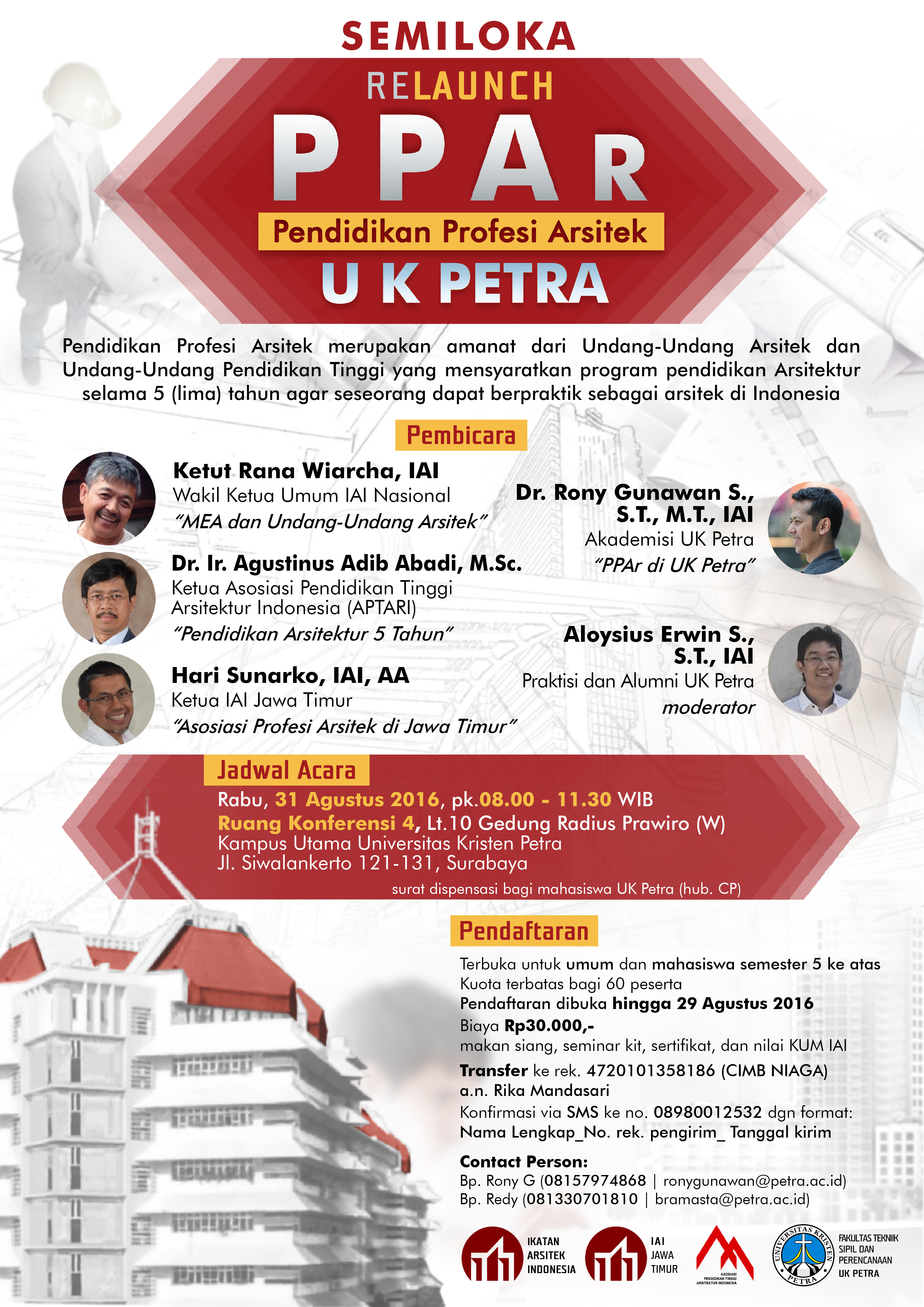Fakultas Teknik Sipilan Perencanaan UK Petra mengadakan acara semiloka untuk para arsitek. Acara ini dilaksanakan pada : 31 Agustus 2016 bertempat di Ruang Konferensi 4 lantai 10 gedung Radius Prawiro.