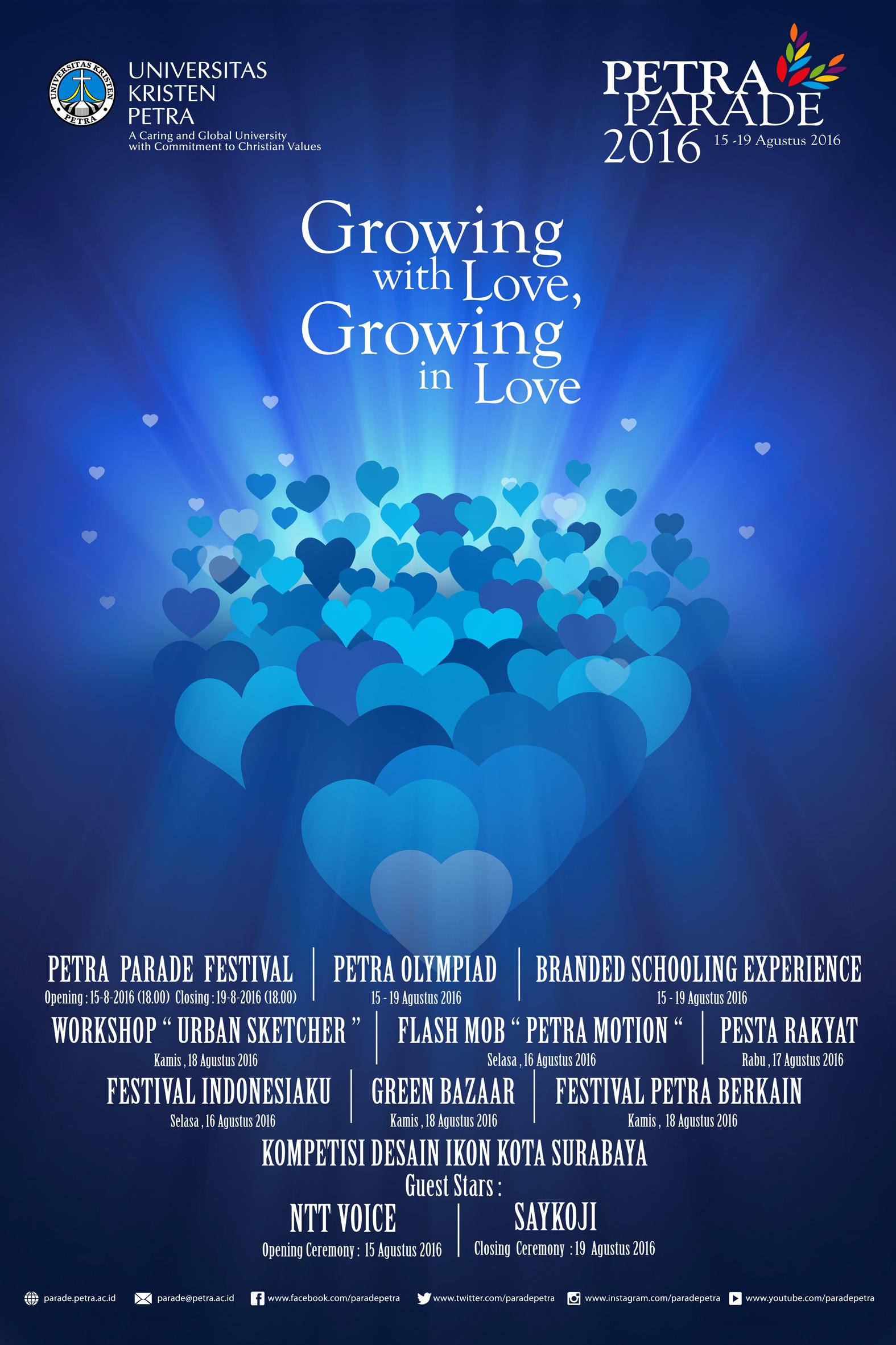 Kembali Universitas Kristen Petra Surabaya menggelar acara Petra Parade 2016 yang dilaksanakan pada 15-19 Agustus 2016. Banyak rangkaian acara yang diadakan, dari lomba-lomba, seminar dan workshop serta bazaar. Penutupan acara ini dimeriahkan oleh artis Saykoji.