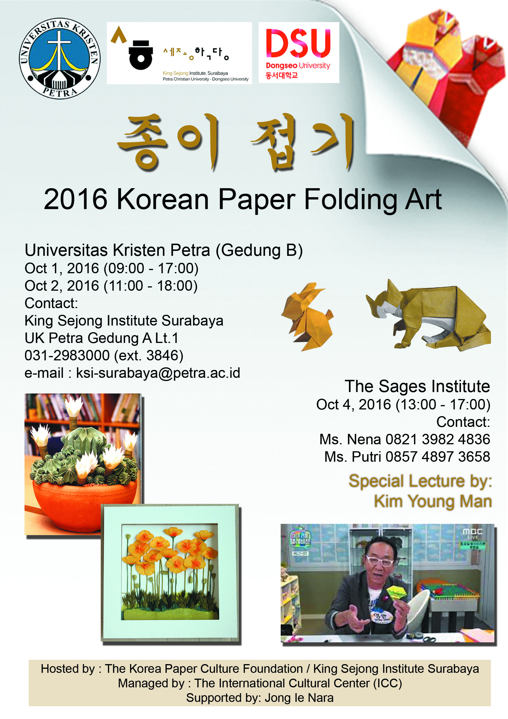 King Sejong Institute Surabaya yang berada di Universitas Kristen Petra mengadakan acara pelatihan dengan tema "2016 Korean Paper Folding Art" yang dilaksanakan pada tanggal 1-2 Oktober 2016 di Gedung A lantai 1 UK Petra. Dengan pembicara Kim Young Man.