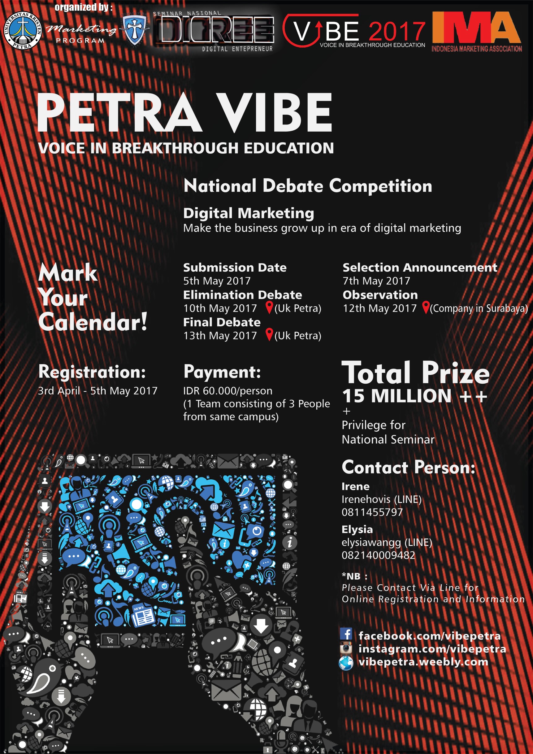 Progdi Manajemen Pemasaran UK Petra mengadakan lomba debate tingkat nasional dengan topik "digital marketing". Pendaftaran dibuka pada tanggal: 03 April 2017 - 05 Mei 2017, sedangkan final lomba pada tanggal 13 Mei 2017. 1 tim terdiri dari 3 orang dari satu kampus.