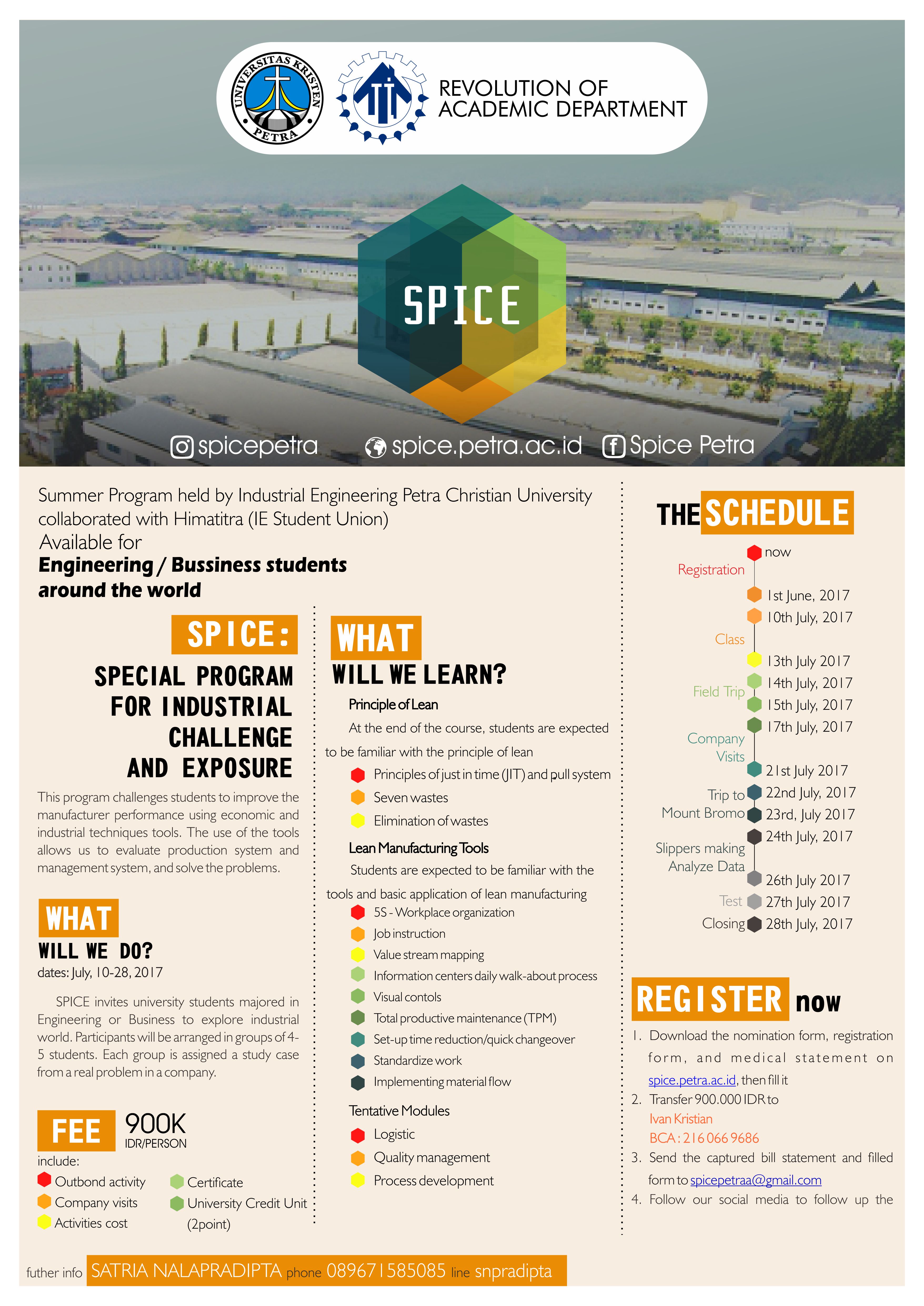 Program Studi Teknik Industri UK Petra mengadakan kegiatan summer program 2017, kegiatan ini diadakan dengan mengunjungi perusahaan sebagai studi kasus. Acara ini diadakan pada 13 Juli 2017 hingga 28 Juli 2017. Demngan biaya pendaftaran 900.000 per peserta.