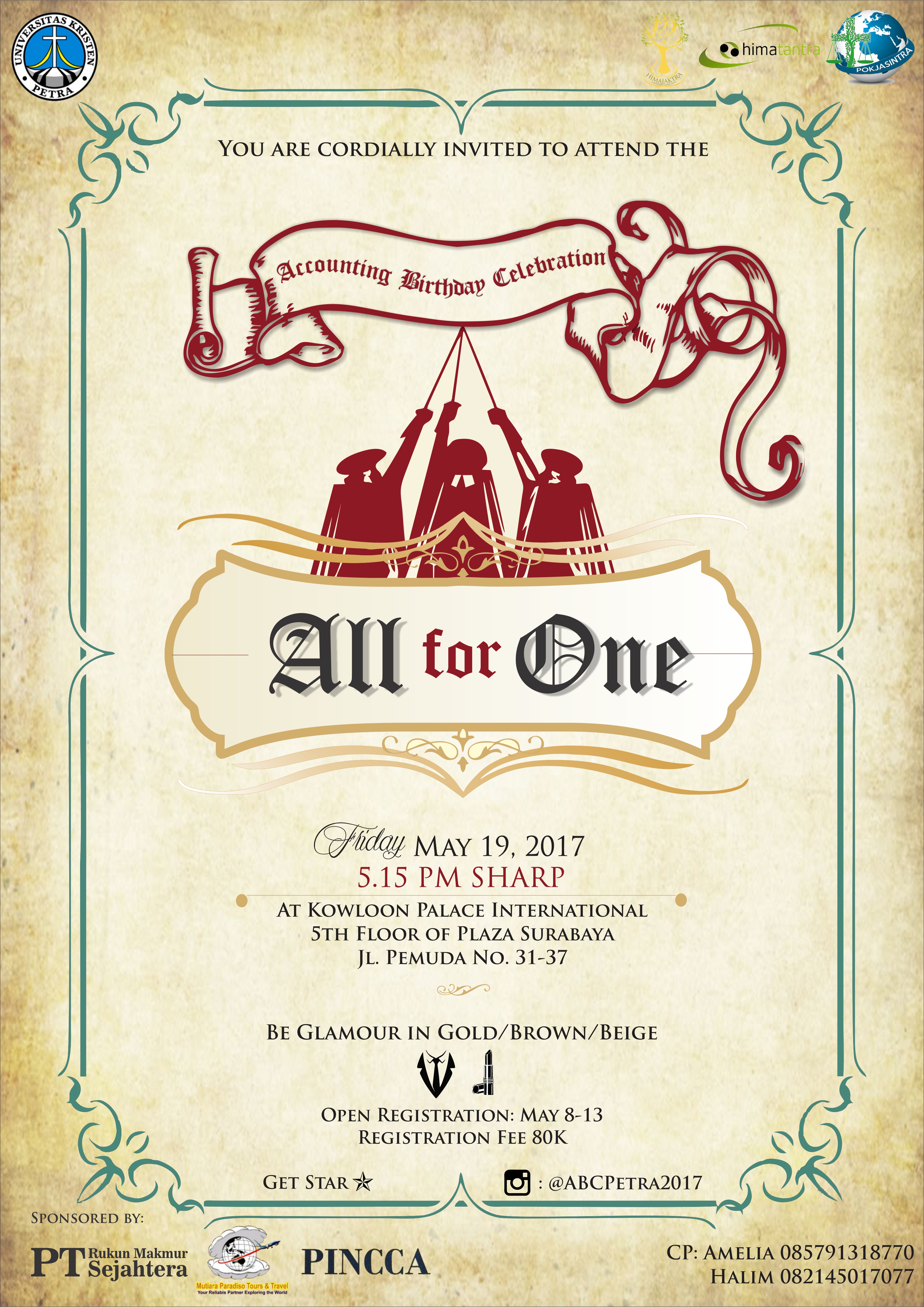 Dalam rangka memeriahkan Ulang Tahun Progdi Akuntansi UK Petra Surabaya, diadakan acara perayaan yang bertemakan "All for one" yang bertempat di Kowloon Palaca International, 5th floor of Plaza Surabaya. Pada tanggal 19 Mei 2017.