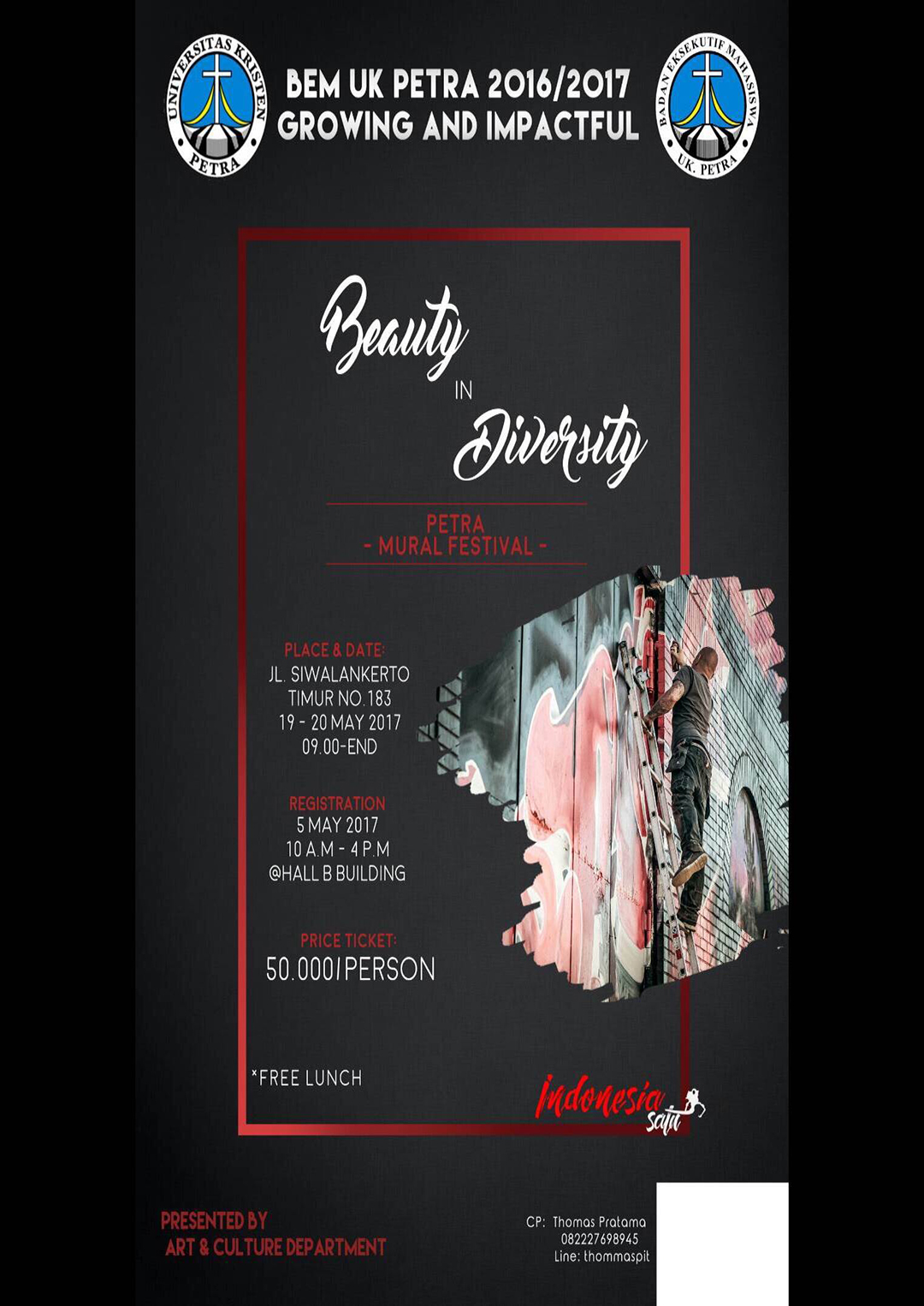 BEM Universitas Kristen Petra mengadakan acara Petra Mural Festival dengan tema " Beauty in Diversity". Acara ini diadakan pada tanggal 19-20 Mei 2017 bertempat di jalan Siwalankerto Timur 183. Dengan biaya pendaftaran 50.000.