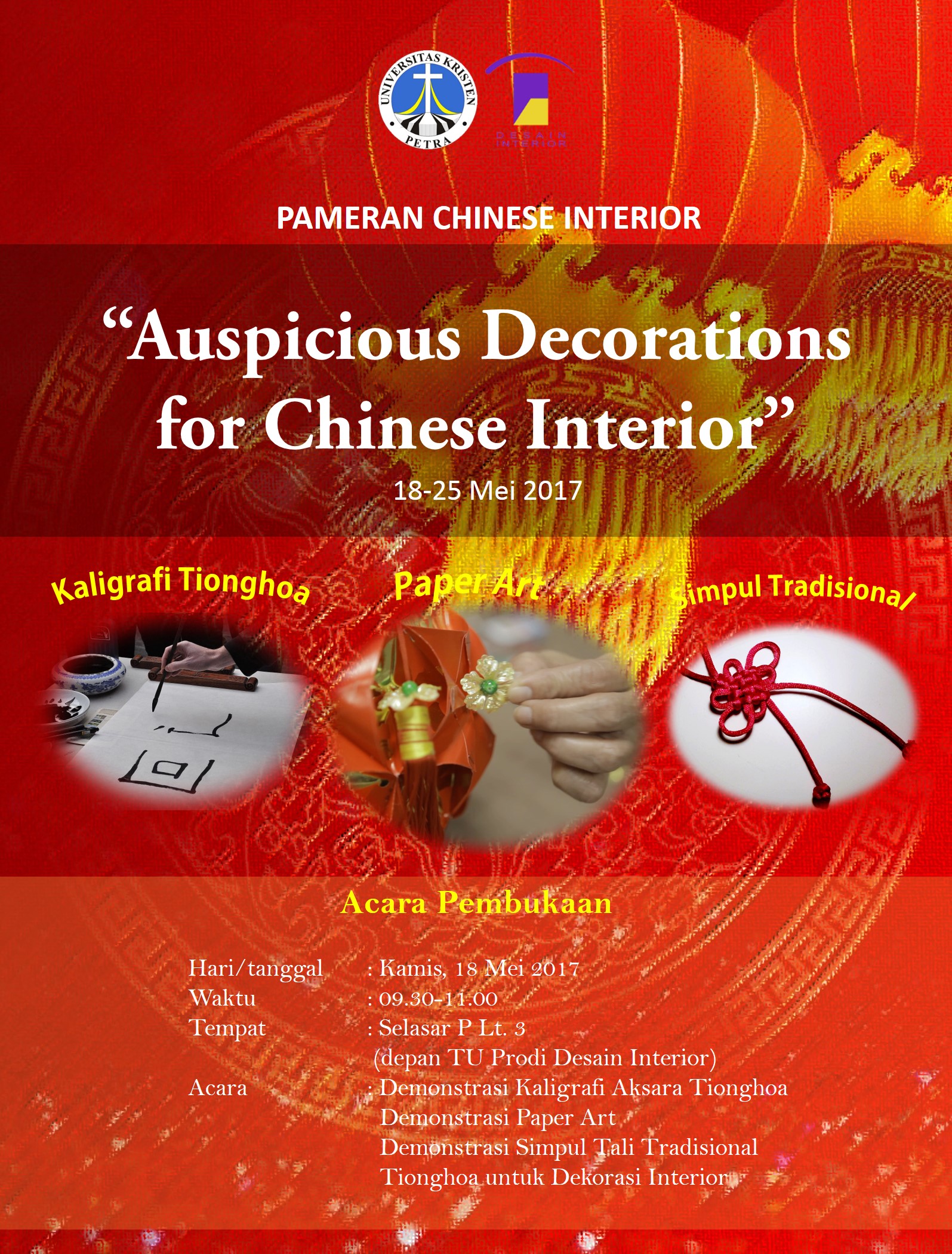 Program Studi teknik Desain Interior UK Petra mengadakan pameran tentang dekorasi dan interior budaya Chinese. Acara yang dilaksanakan pada 18 Mei 2017 mengangkat tema "Auspicious decorations for Chinese interior", diadakan di selasar gedung P. lantai 3 Universitas Kristen Petra.