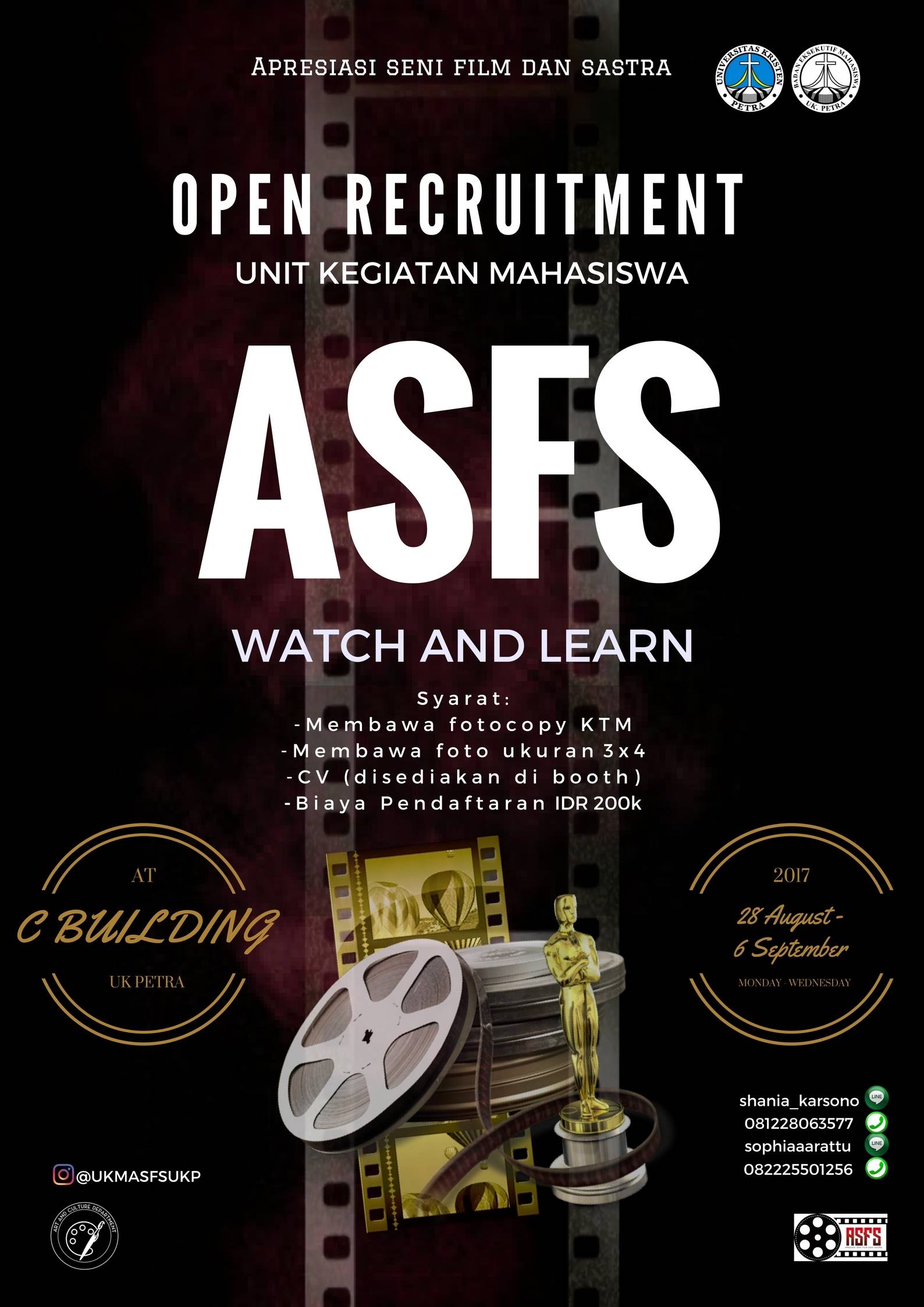 UKM ASFS Universitas Kristen Petra Surabaya membuka pendaftaran bagi mahasiswa baru UK Petra untuk bergabung dalam UKM ASFS. Pendaftaran dilaksanakan pada 28 Agustus hingga 6 September 2017, di gedung C.