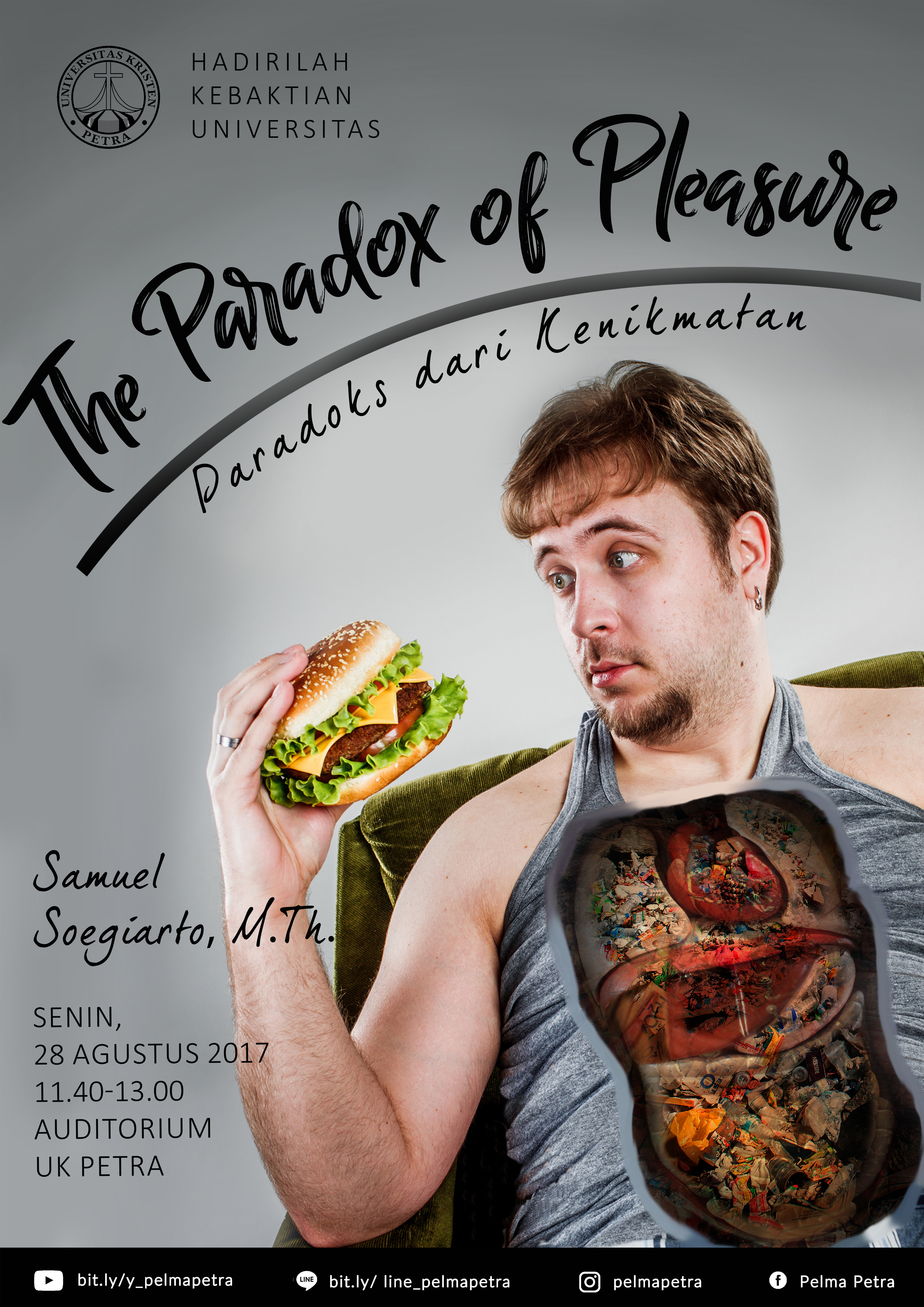 Kebaktian Universitas Kristen Petra Surabaya setiap hari Senin, diadakan pada tanggal 28 Agustus 2017 dengan menghadirkan bapak Samuel Soegiarto, M.Th. Dengan mengangkat topik The Paradox of pleasure (paradoks dari kenikmatan). Bertempat di Auditorium UK Petra.