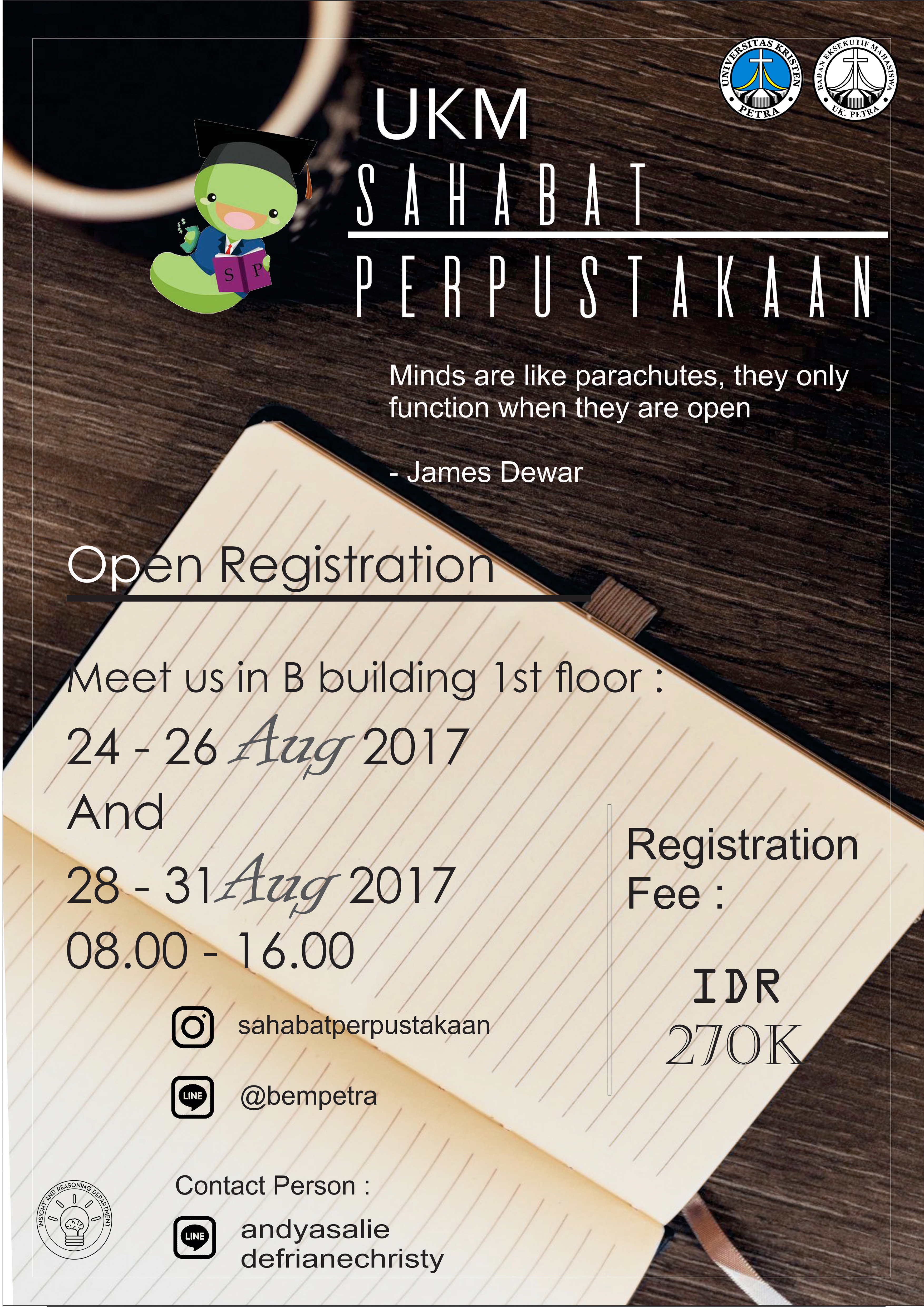UKM Sahabat Perpustakaan Universitas Kristen Petra Surabaya membuka pendaftaran untuk menjadi anggota UKM SP. Pendaftaran dibuka pada tanggal 24-26 Agustus 2017 dan 28-31 Agustus 2017 bertempat di selasar gedung B. lantai 1.