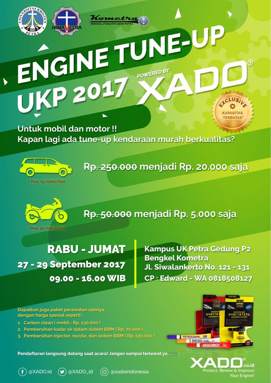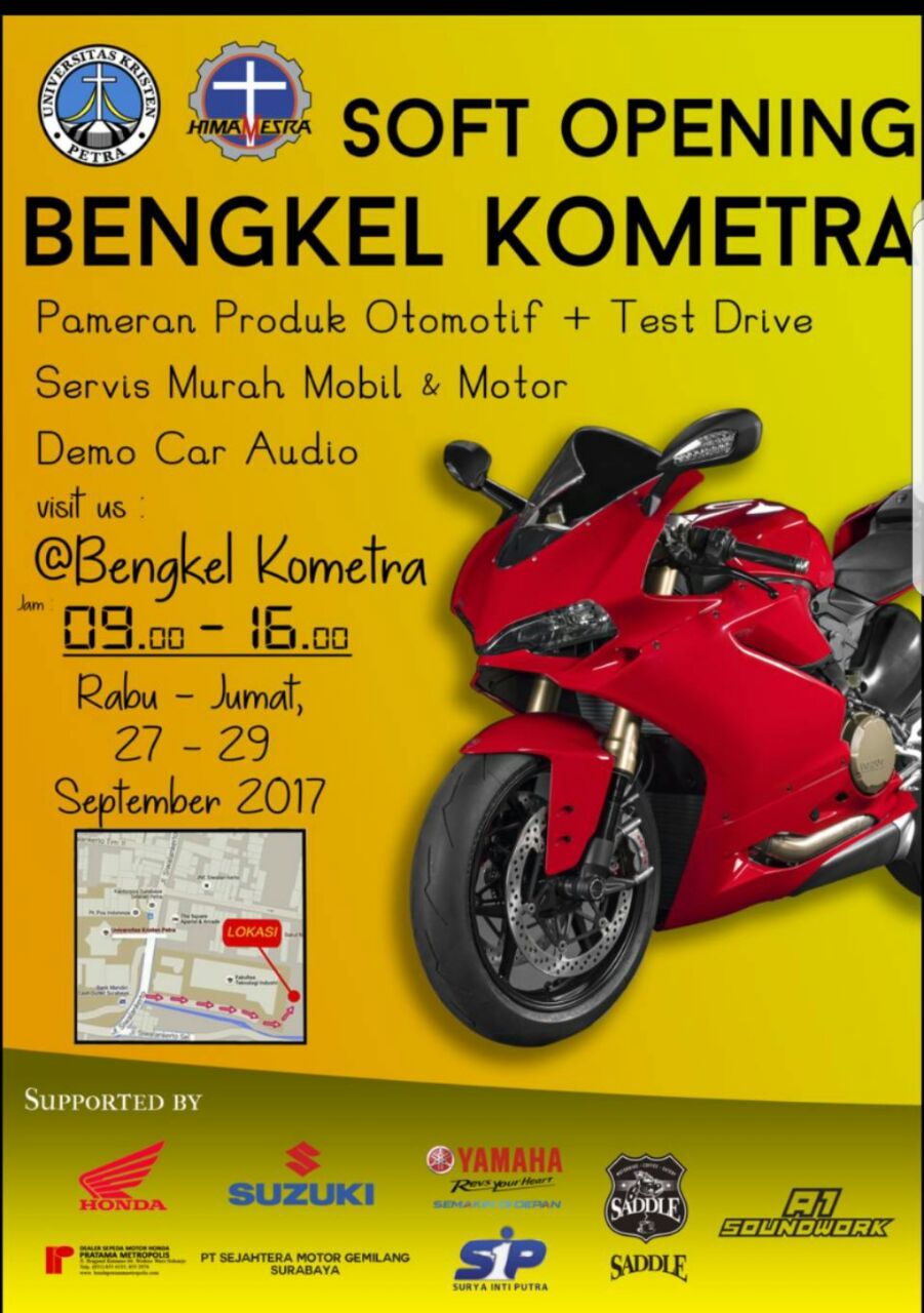 Dalam rangka menyambut Dies Natalis ke-35 Progdi Teknik Mesin, jurusan Otomotif UK Petra mengadakan service murah sekaligus soft opening bengkel Kometra. Acara ini diselenggarakan pada 27-29 September 2017, bertempat di bengkel Kometra UK Petra.
