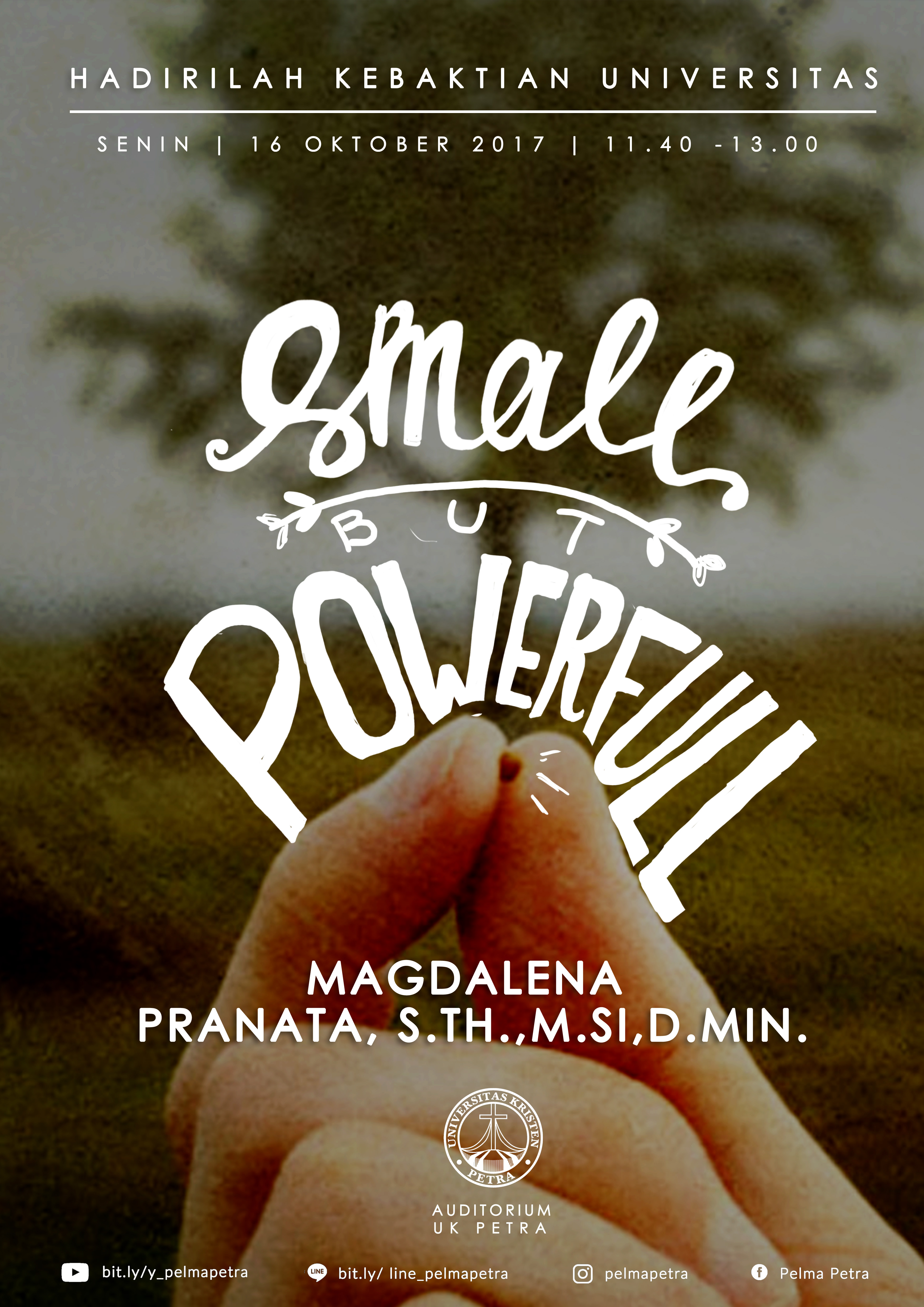 Pusat Kerohanian UK Petra mengundang civitas Universitas Kristen Petra, untuk hadir dalam kebaktian universitas yang diadakan pada tanggal 16 Oktober 2017 di auditorium UK Petra. Kebaktian ini mengangkat tema "Small but powerfull", dengan pengkhotbah ibu Magdalena Pranata.