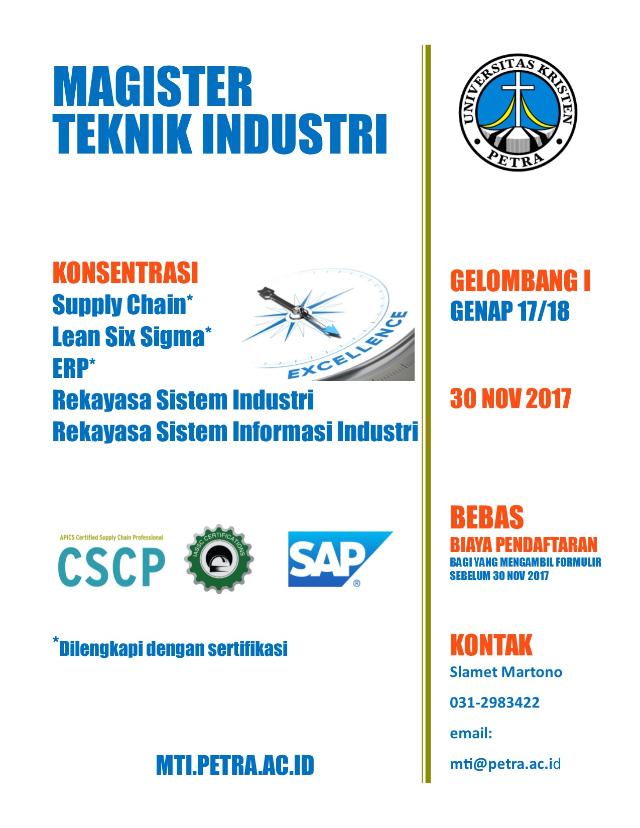 Magister Teknik Industri UK Petra Surabaya, membuka pendaftaran gelombang I semester genap tahun ajaran 2017/2018. Pendaftaran dibuka hingga 30 November 2017. Informasi lebih lanjut bisa dilihat di mti.petra.ac.id.