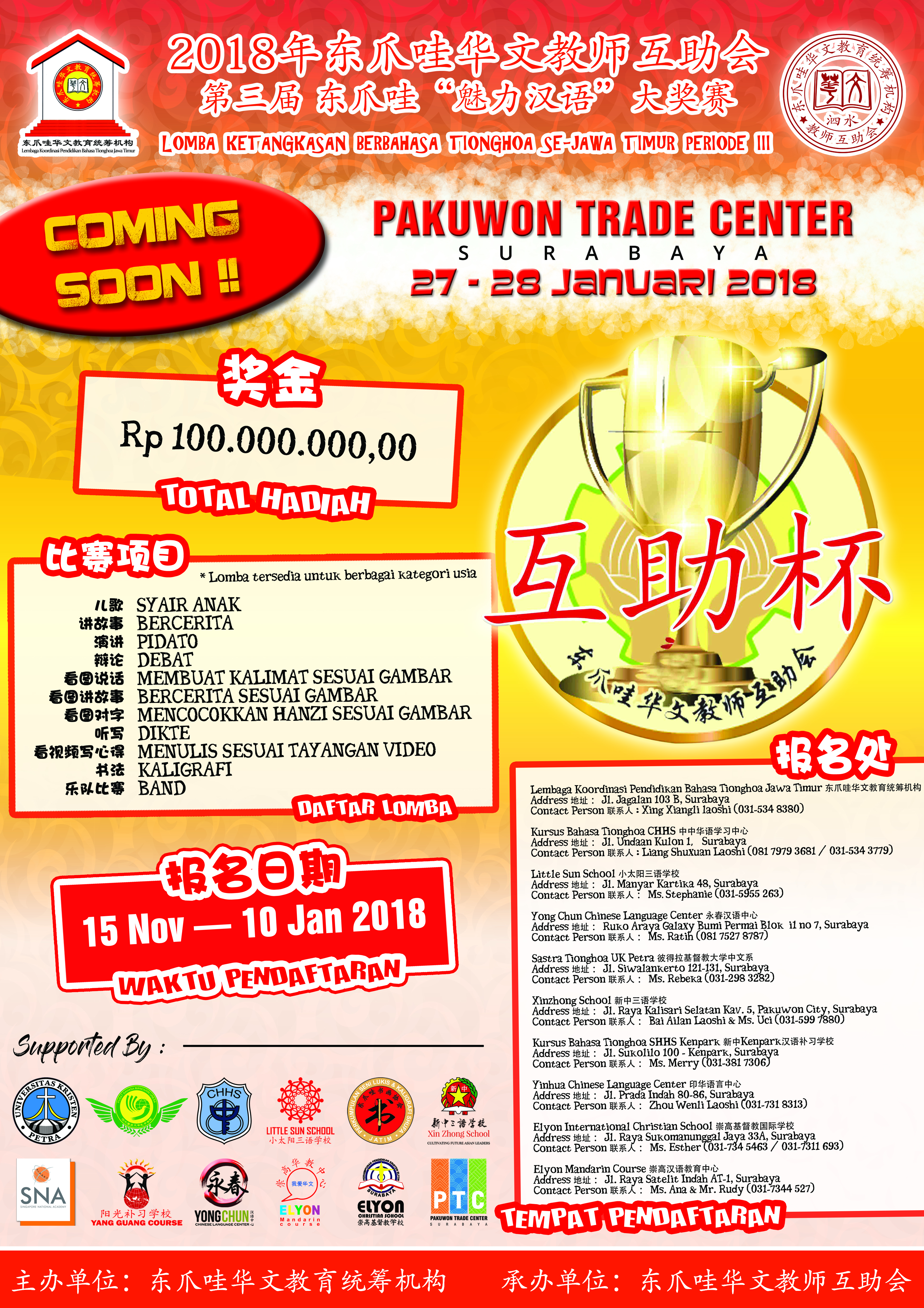 Program Studi Sastra Tionghoa UK Petra bekerja sama dengan beberapa pusat studi bahasa mandarin di Surabaya mengadakan lomba ketangkasan berbahasa Tionghoa se Jawa Timur periode III. Lomba diadakan di Pakuwon Trade Center Surabaya pada tanggal 27-28 Januari 2018. Dengan total hadiah Rp.100.000.000. berbagai lomba banyak diadakan pada kali ini.