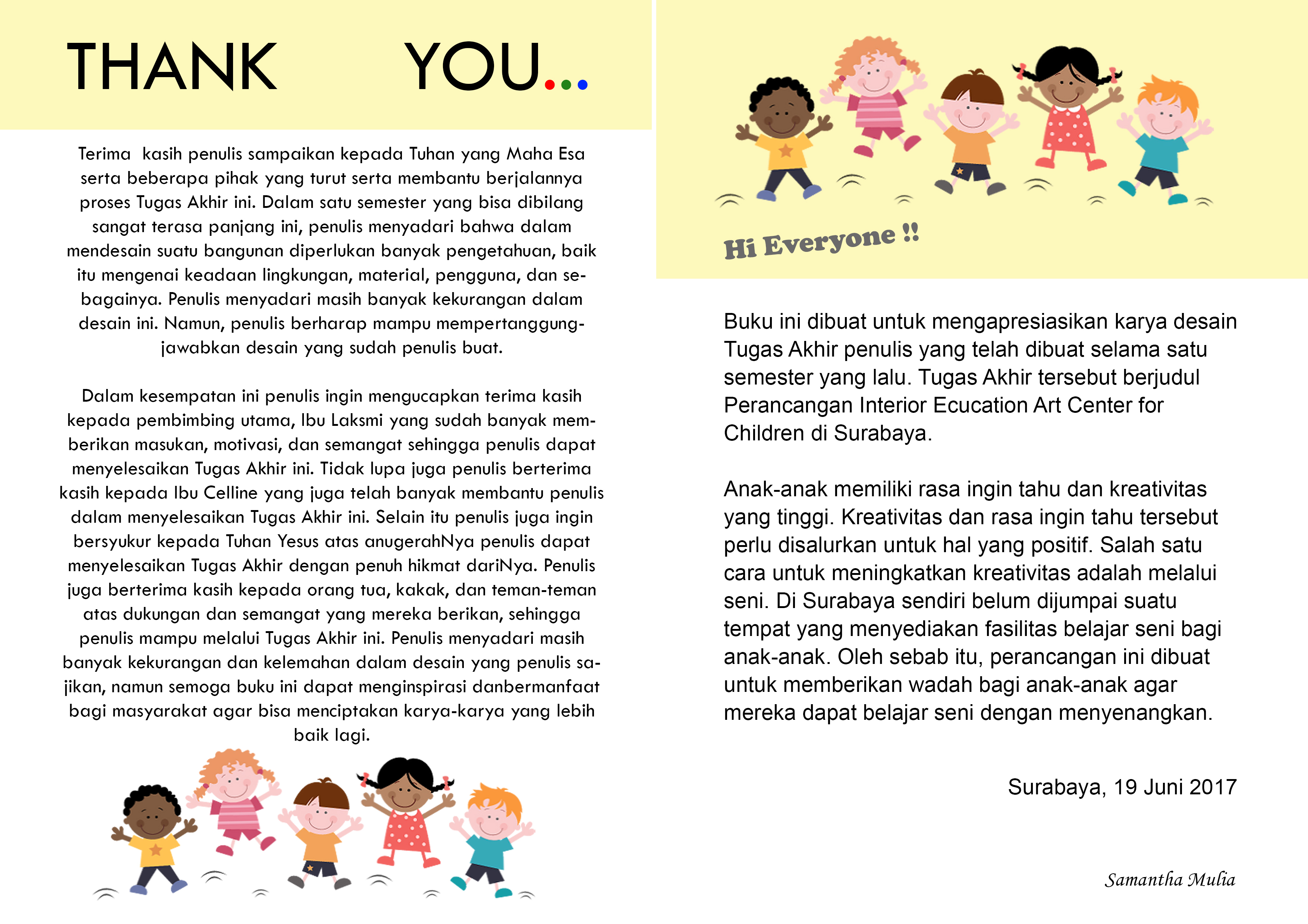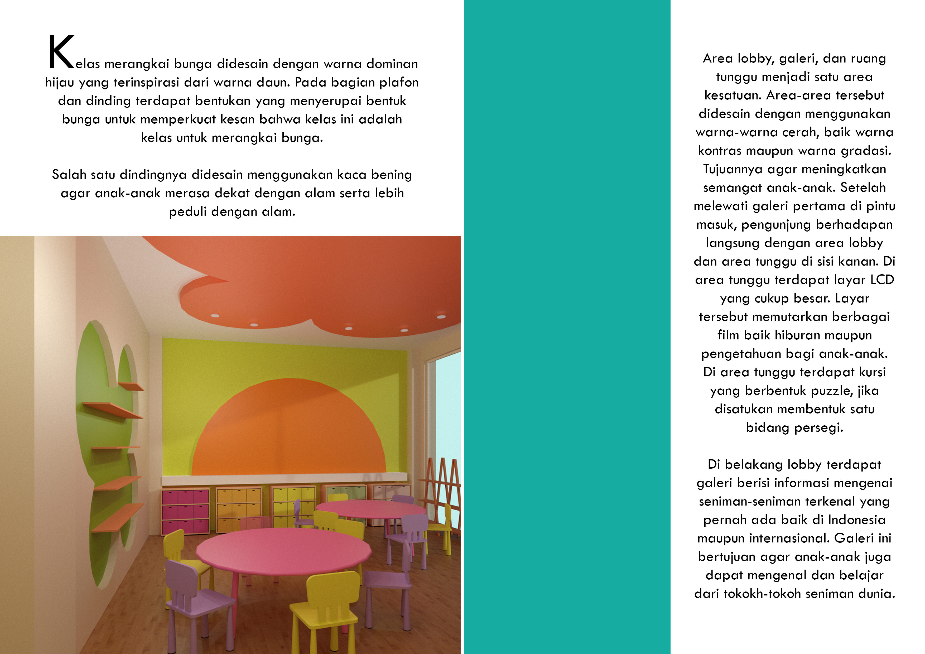 Anak-anak memiliki rasa ingin tahu dan kreativitas yang tinggi. Rasa ingin tahu dan kreativitas tersebut dapat diarahkan ke arah yang positif agar mereka menemukan bakat dan minatnya lebih dini. Kreativitas tersebut dapat disalurkan melalui seni. Perancangan ini menyediakan Pusat Pendidikan Seni bagi anak-anak untuk dapat mencoba hal baru serta meningkatkan kreativitas mereka sejak dini. Perancangan ini berisi fasilitas kelas-kelas seperti kelas lukis, clay, art paper, cake decoration, merangkai bunga, batik, kelas serbaguna dan fasilitas lainnya seperti perpustakaan, kafe, ruang kantor, lobi dan area bermain. Konsep “Eduplay and Fun” menciptakan suasana ruang yang menyenangkan serta menyesuaikan karakteristik masing-masing anak. Konsep diaplikasikan melalui permainan warna, bentuk dan ukuran.