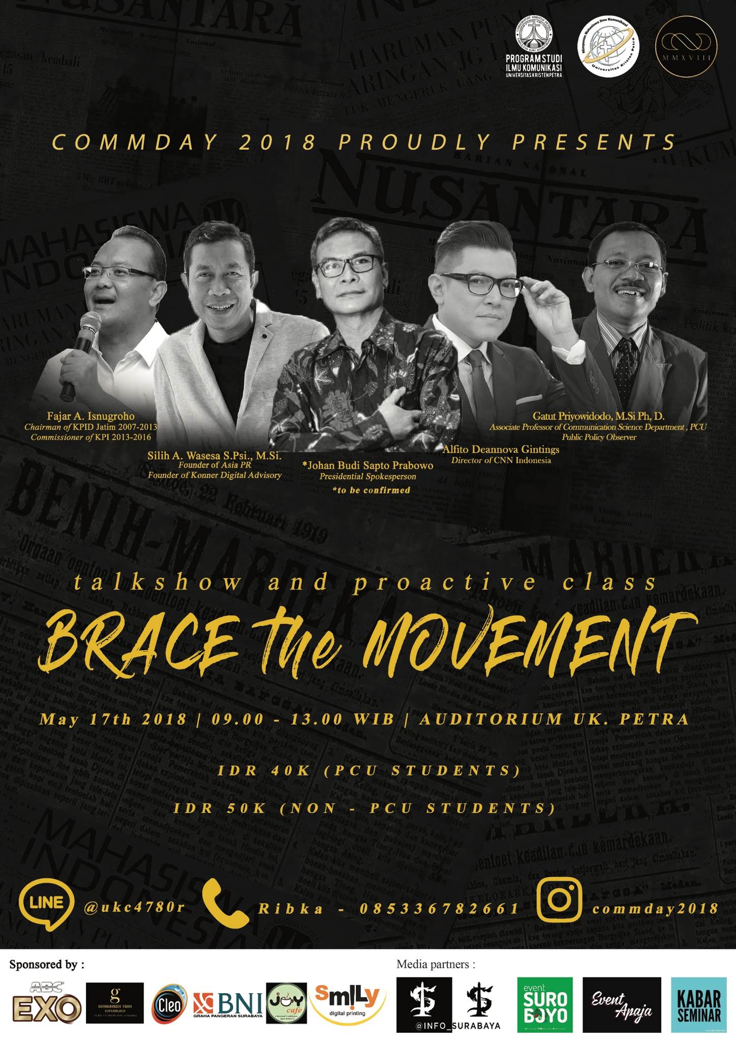 Program Ilmu Komunikasi UK Petra Mengadakan acara Talkshow and proactive class: brace to movement. Dengan mendatangkan beberapa narasumber, acara ini diadakan pada 17 Mei 2018 bertempat di Auditorium UK Petra. Biaya pendaftaran peserta sebesar 40.000 bagi mahasiswa dan 50.000 untuk non mahasiswa.