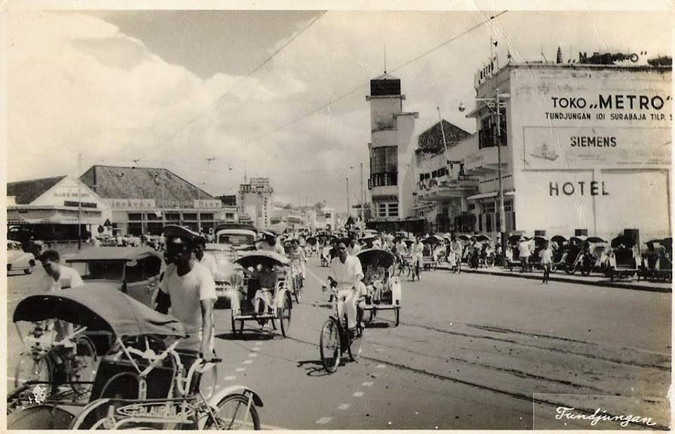 Keramaian lalu lintas di depan Toko Metro Ujung Surabaya