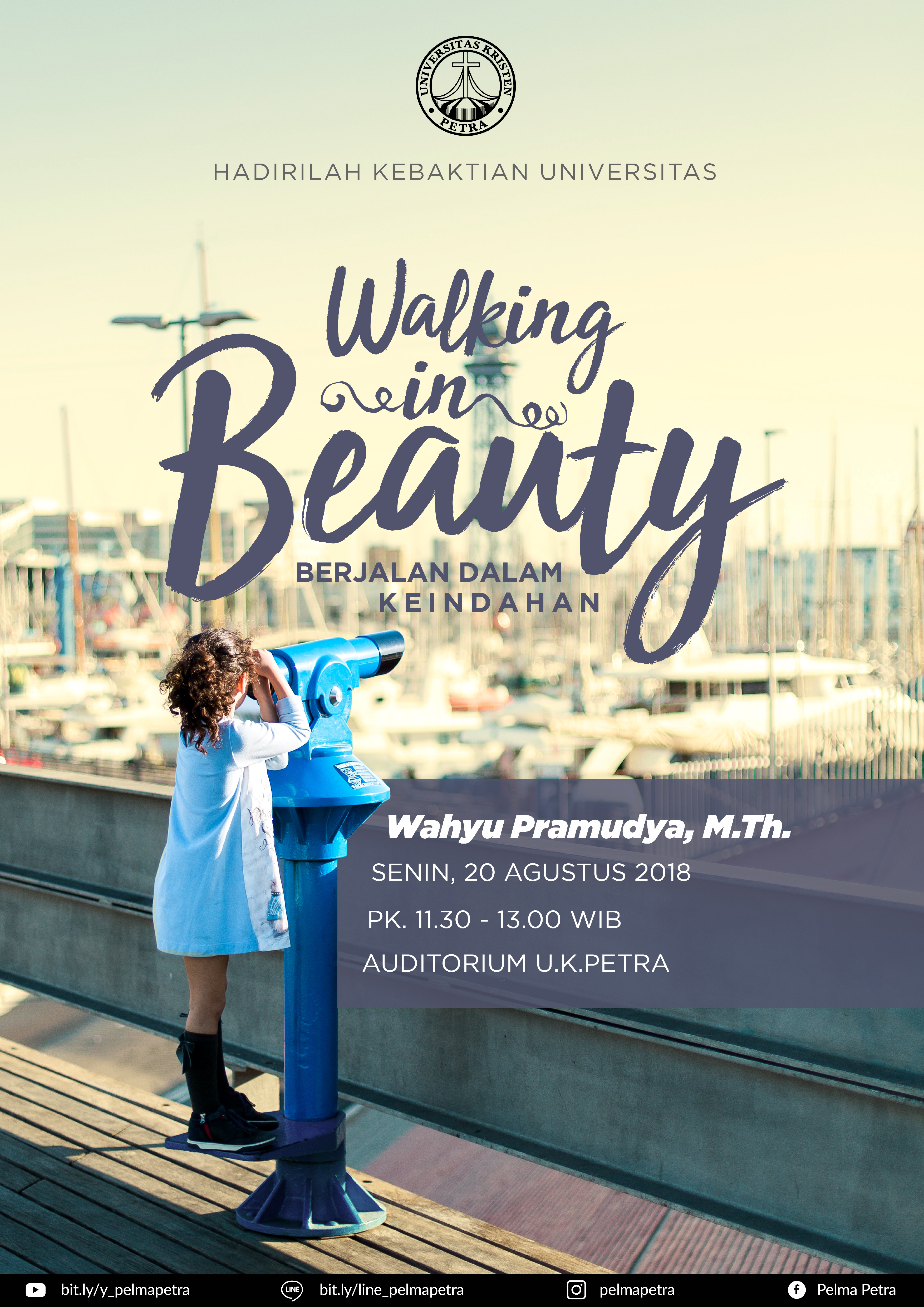 Universitas Kristen Petra Surabaya mengundang seluruh civitas akademika UK Petra untuk turut hadir dalam acara kebaktian universitas setiap hari Senin. Pada tanggal 20 Agustus 2018 bertempat di Auditorium UK Petra, kebaktian ini mengangkat tema walking in beauty (berjalan dalam keindahan), dengan pengkhotbah Wahyu Pramudia.