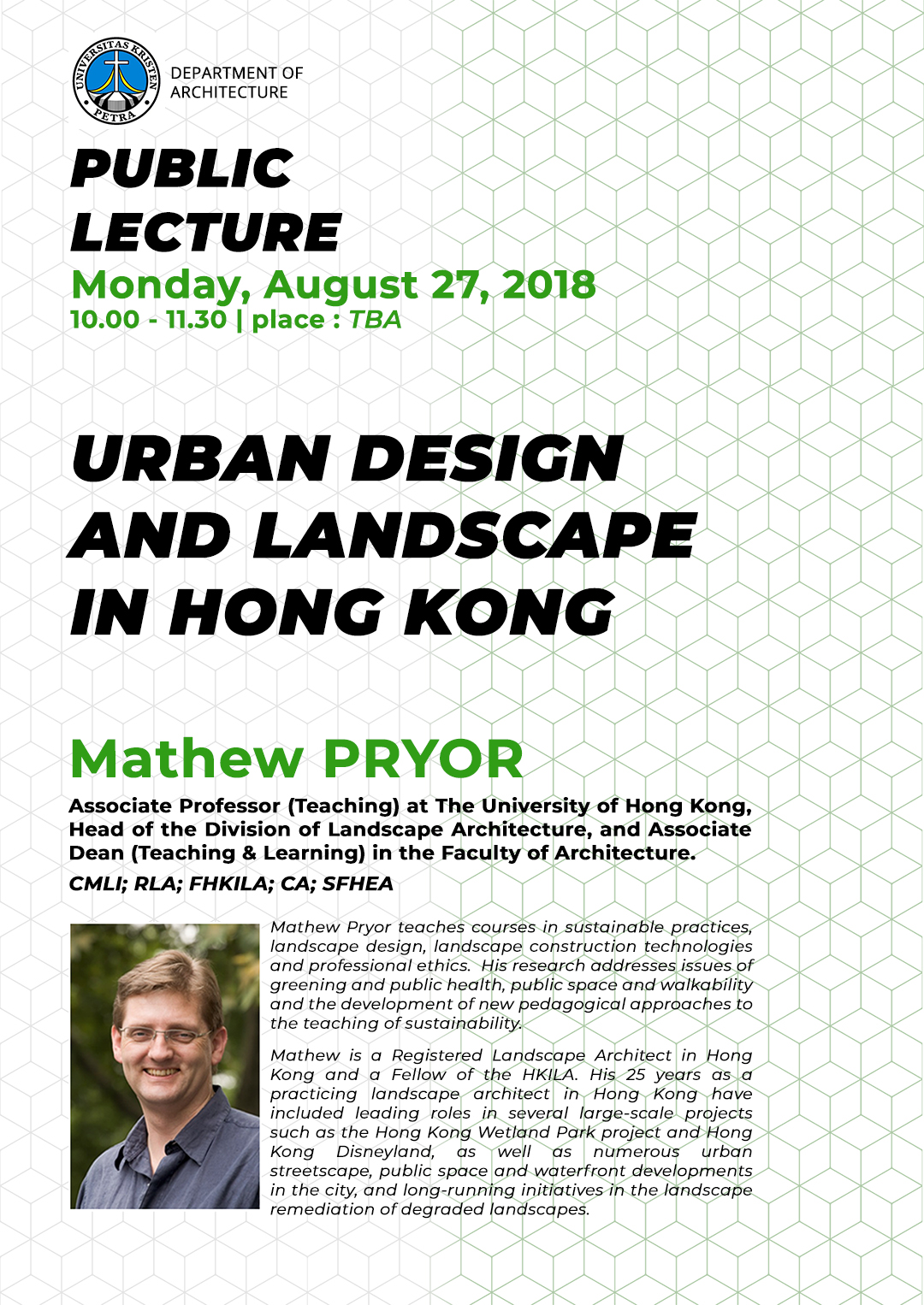 Program Studi Teknik Arsitektur Universitas Kristen Petra Surabaya pada tanggal 27 Agustus 2018 mengadakan kuliah terbuka dengan menghadirkan Mathew Pryor sebagai narasumber. Topik pembahasan acara ini adalah "Urban design and landscape in Hongkong".