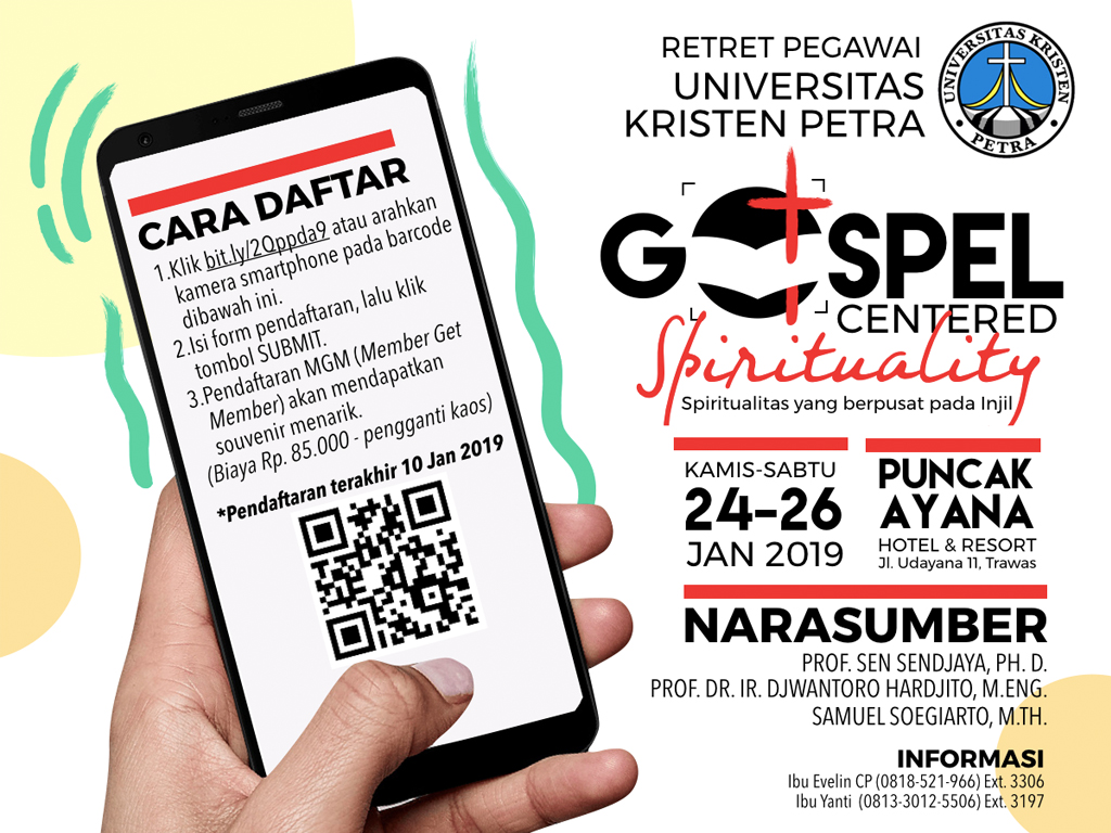 Universitas Kristen Petra Surabaya mengundang seluruh pegawai UK Petra, untuk ikut serta dalam retreat pegawai 2019. Acara ini dilaksanakan pada tanggal 24-26 Januari 2019 bertempat di Ayana Hotel Trawas. Dengan menghadirkan narasumber Prof. Sen Sendjaya, Ph.D., Prof. Dr. Ir. Djwantoro Hardjito, M.Eng., Samuel Soegiarto, M.Th.