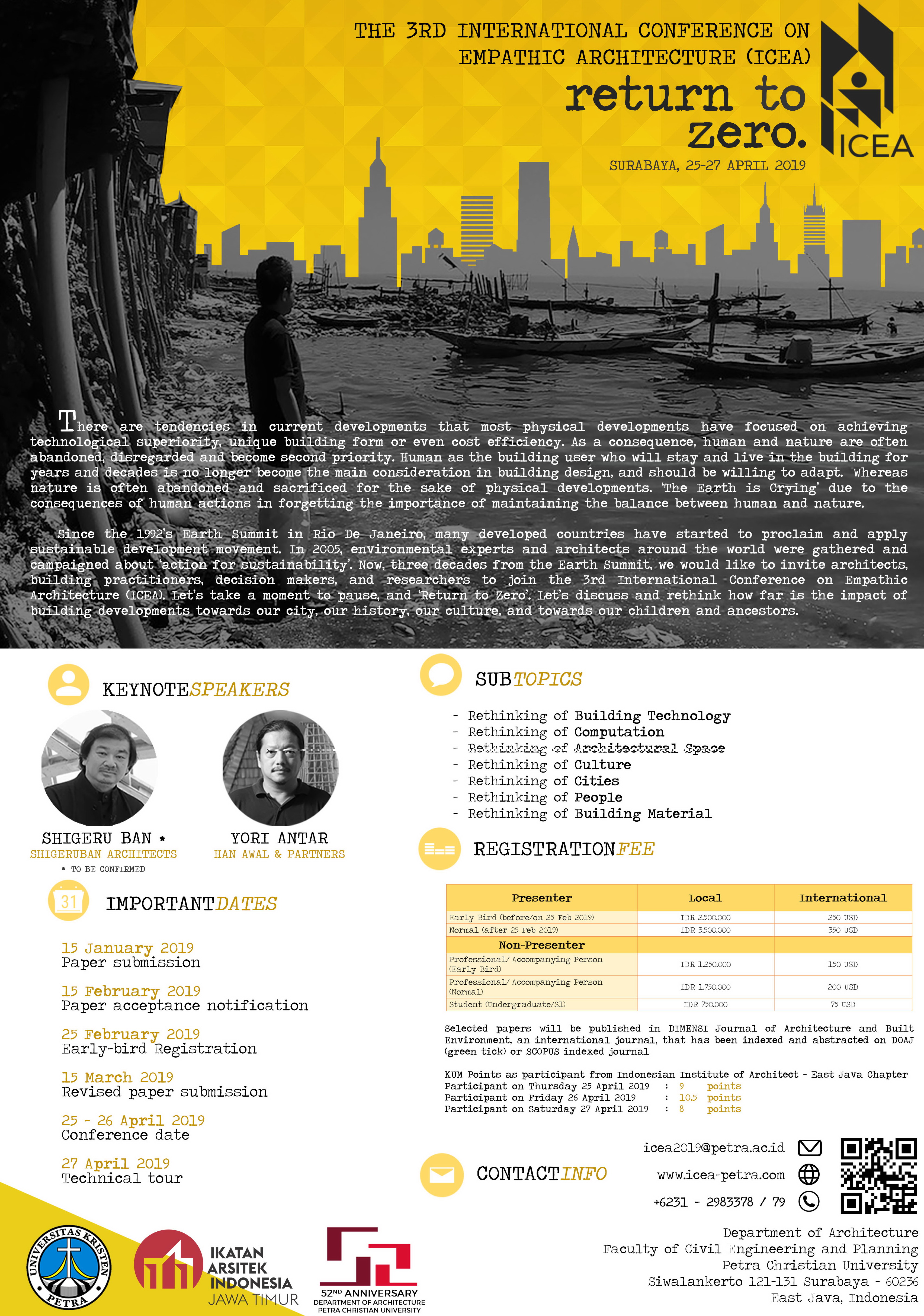Program studi teknik Arsitektur Universitas Kristen Petra Surabaya mengadakan acara The 3rd International Conference on Empathic Architecture (ICEA). Acara ini dilaksanakan pada 25-27 April 2019 di Surabaya, dengan mengangkat topik "return to zero".