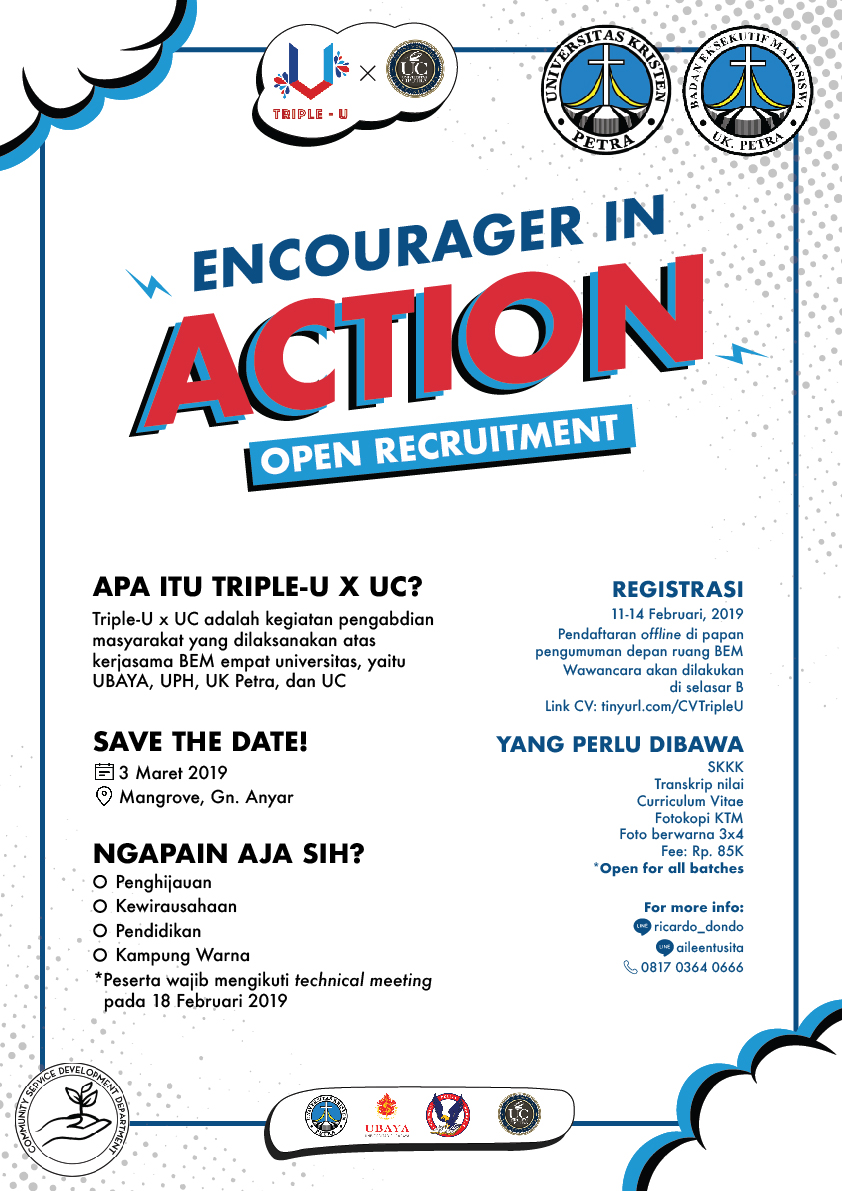 Kegiatan pengabdian kepada masyarakat yang di koordinasi oleh BEM dari 4 universitas (UPH, UBAYA, UC, UK Petra) yang bernama TRIPLE-U X UC, membuka kesempatan bagi mahasiswa UK Petra untuk ikut bergabung dalam acara ini. Acara ini dilaksanakan pada 03 Maret 2019 bertempat di Mangrove, Gunung Anyar Surabaya.