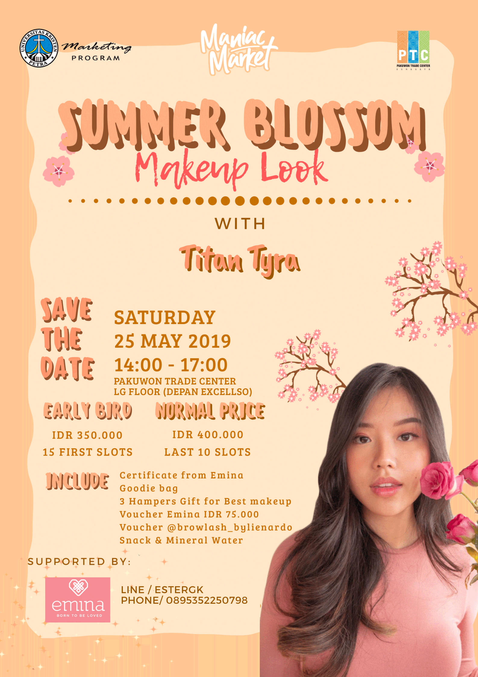 Manajemen Pemasaran Universitas Kristen Petra Surabaya mengadakan workshop dengan tema "Summer blossom make up look". Acara ini diselenggarakan pada Sabtu, 25 Mei 2019 bertempat di Pakuwon Trade Center LG Floor. Dengan menghadirkan Titan Tyra sebagai narasumber.