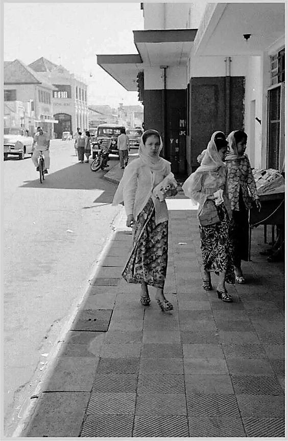 3 Wanita sedang jalan-jalan di jalan Tunjungan pada tahun 1955.