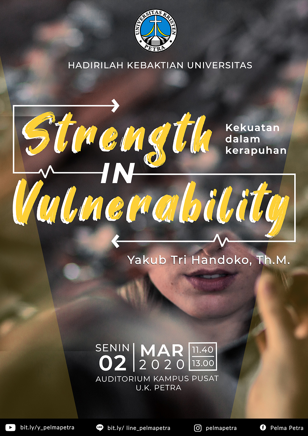 Universitas Kristen Petra mengundang seluruh sivitas akademika UK Petra pada Senin, 02 Maret 2020 untuk datang dalam kebaktian universitas. Pada kesempatan ini kebaktian bertemakan: Strength in vulnerability (kekuatan dalam kerapuhan) dengan pengkhotbah Yakub Tri Handoko, M.Th.
