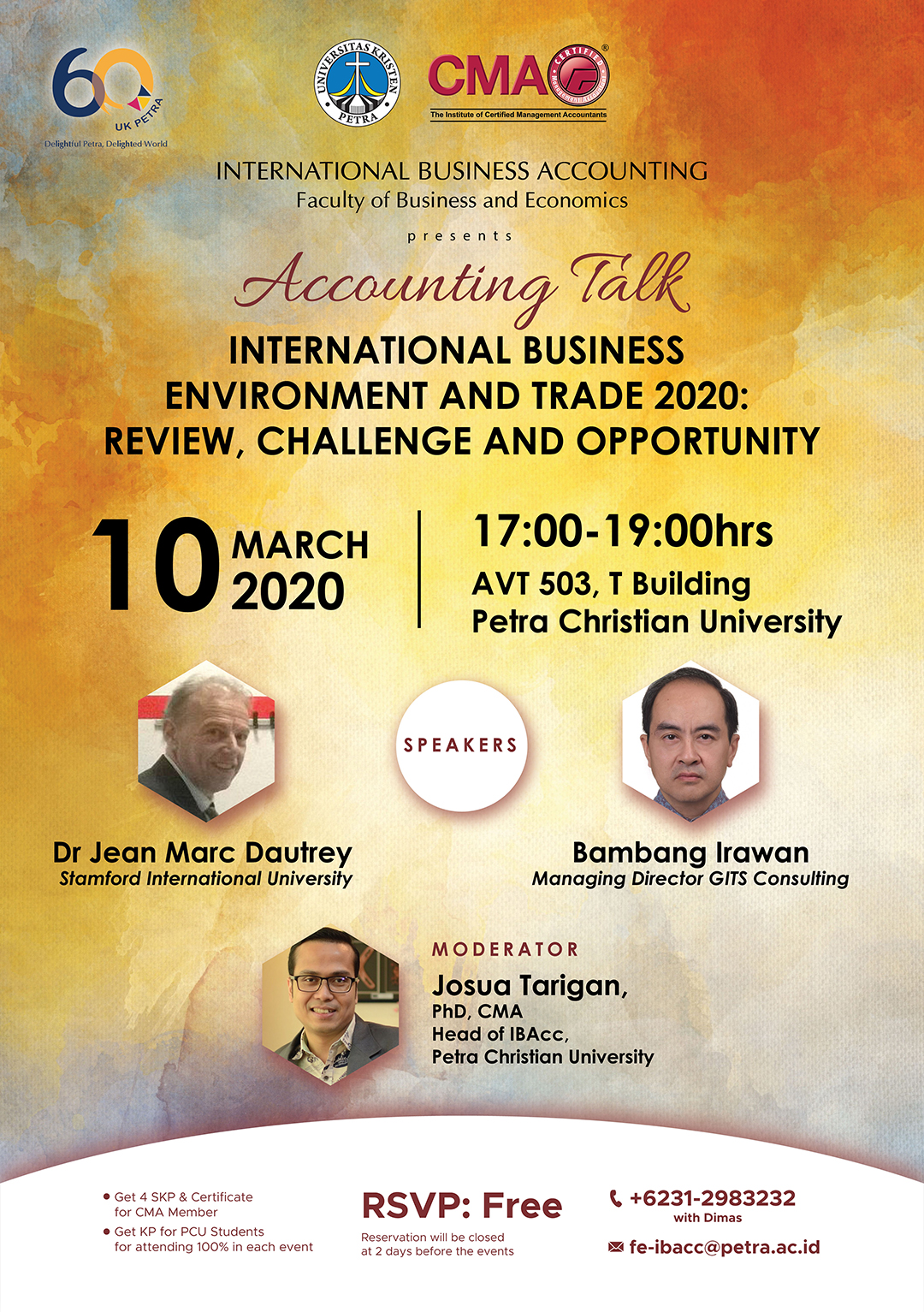 Program Studi International Business Accounting Universitas Kristen Petra Surabaya pada tanggal 10 Maret 2020 mengadakan acara seminar dengan topik "international business environment and trade 2020", bertempat di AV.T.503 UK Petra. Dengan narasumber Dr. Jean Marc Dautrey dan Bambang Irawan.