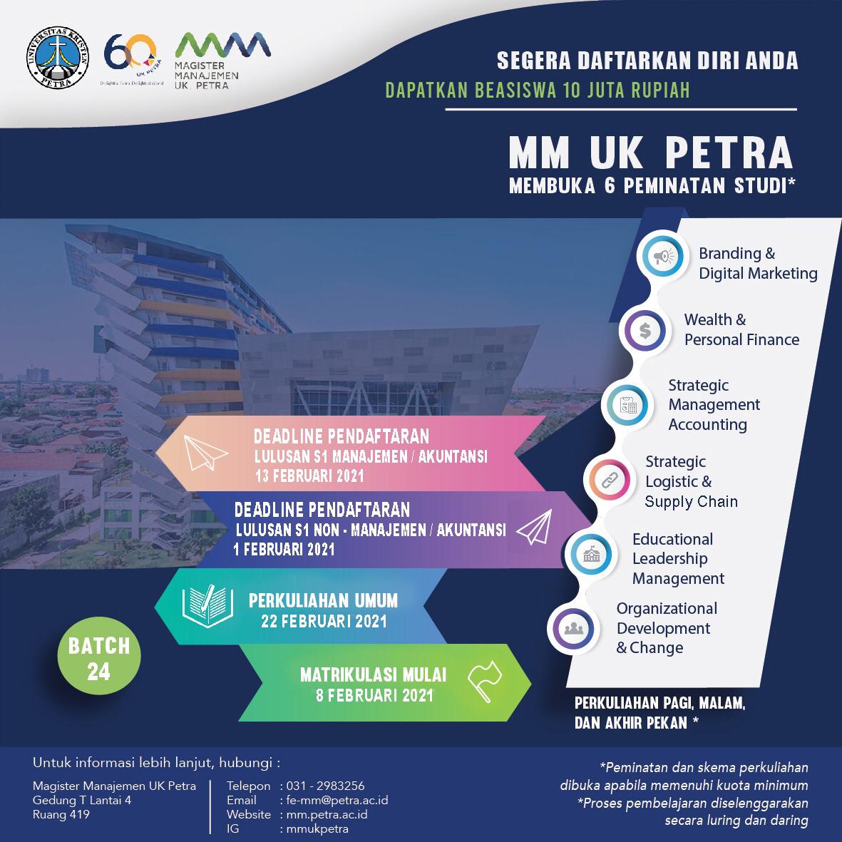 Program Magister Manajemen UK Petra Surabaya, membuka pendaftaran mahasiswa baru. Pendaftaran terakhir pada tanggal 13 Februari 2021. Untuk informasi lebih lanjut bisa hubungi http://mm.petra.ac.id