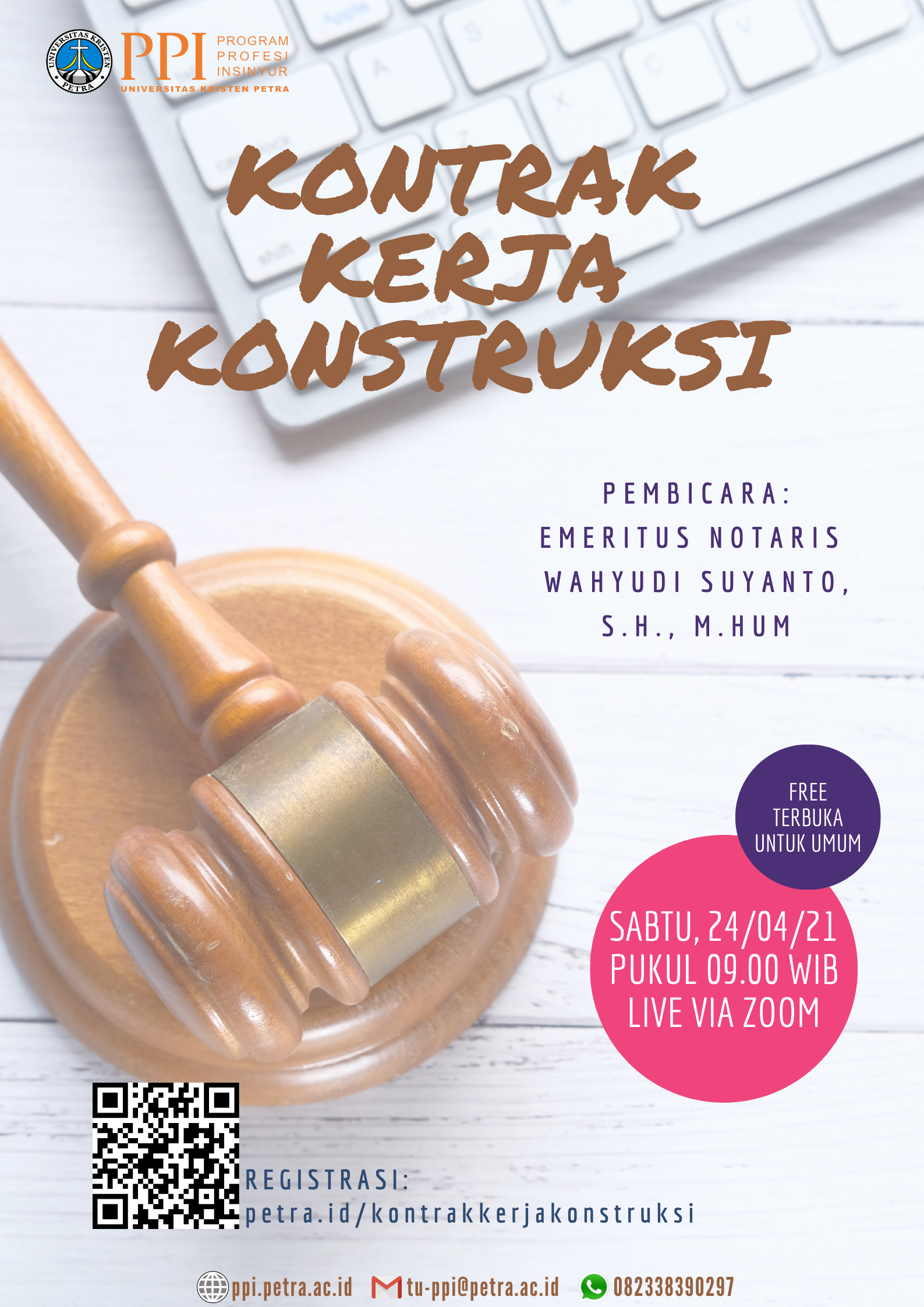 Fakultas Teknologi INdustri UK Petra Surabaya, pada tanggal 24 April 2021 mengadakan webinar dengan topik kontrak kerja konstruksi. Acara ini diadakan secara online menggunakan aplikasi Zoom, dan sebagai narasumber Wahyudi Suyanto, S.H., M.Hum.