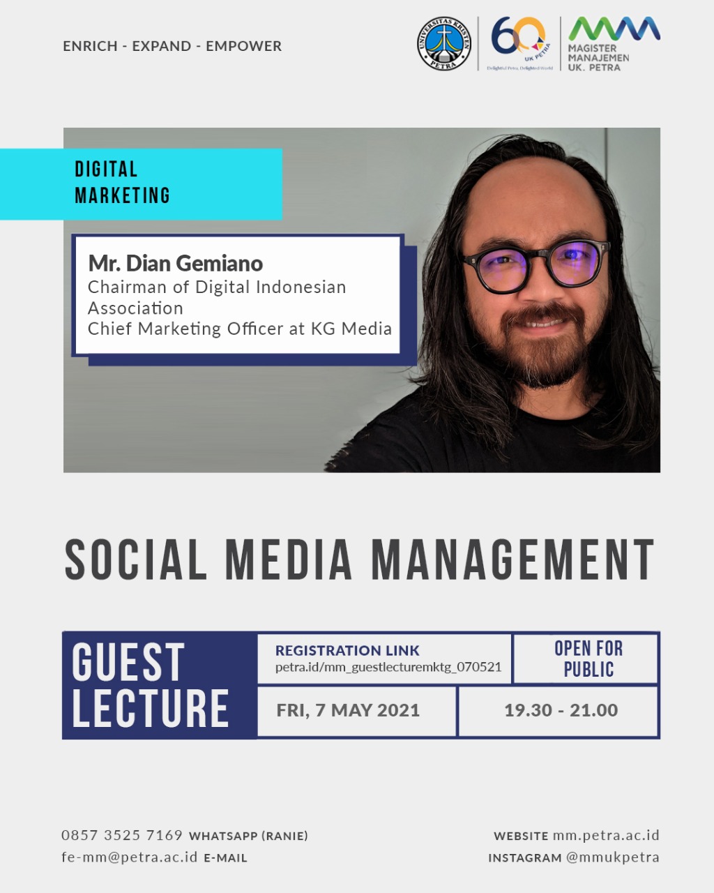 Program Studi Magister Manajemen UK Petra, pada tanggal 07 Mei 2021 jam 19.30 mengadakan acara kuliah tamu digital marketing, dengan topik "Social Media Management". Acara ini dilaksanakan secara online dengan narasumber Dian Gemiano.