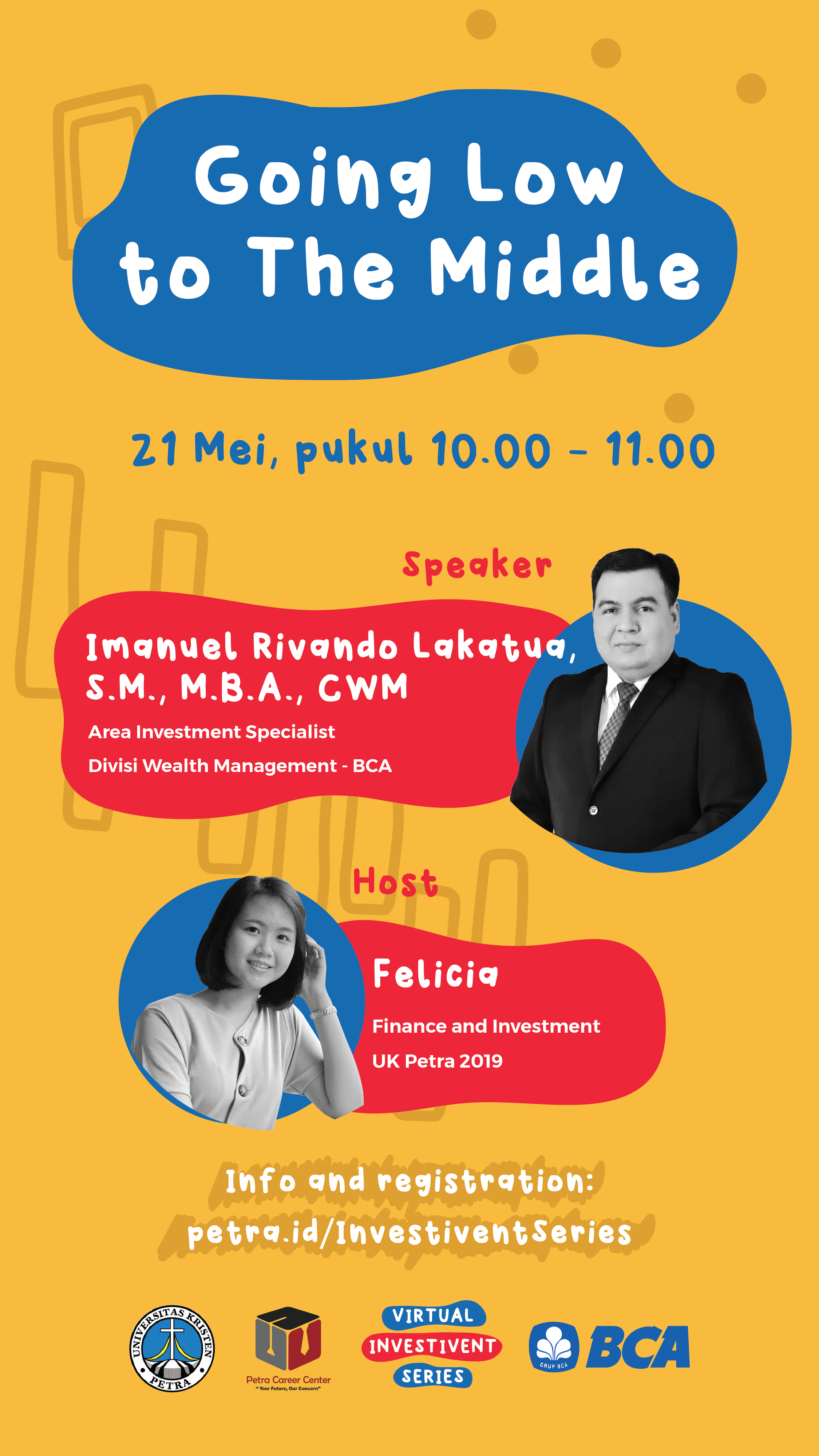 Pada tanggal 21 Mei 2021 pukul 10.00 WIB, Pusat Karir UK Petra mengadakan acara Investivent webinar: going low to the middle. Acara yang dilaksanakan secara daring ini menghadirkan Imanuel Rivando Lakatua, S.M., M.B.A. sebagai narasumber.