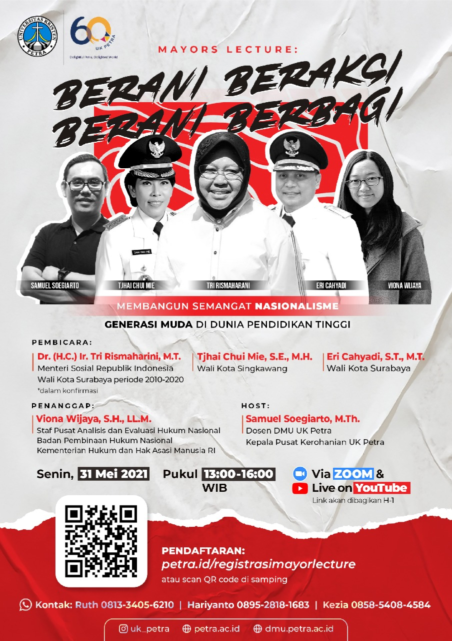 Mayors lecture: berani beraksi, berani berbagi, akan diselenggarakan oleh Departemen Mata Kuliah Umum Universitas Kristen Petra Surabaya pada tanggal: 31 Mei 2021 jam 13.00 WIB. Acara ini dilakukan secara online melalui aplikasi Zoom. Sebagai narasumber adalah Tjhai Chui Mie, S.E., M.H. dan Eri Cahyadi, S.T., M.T. serta (dalam konfirmasi) Ir. Tri Rismaharini,M.T.