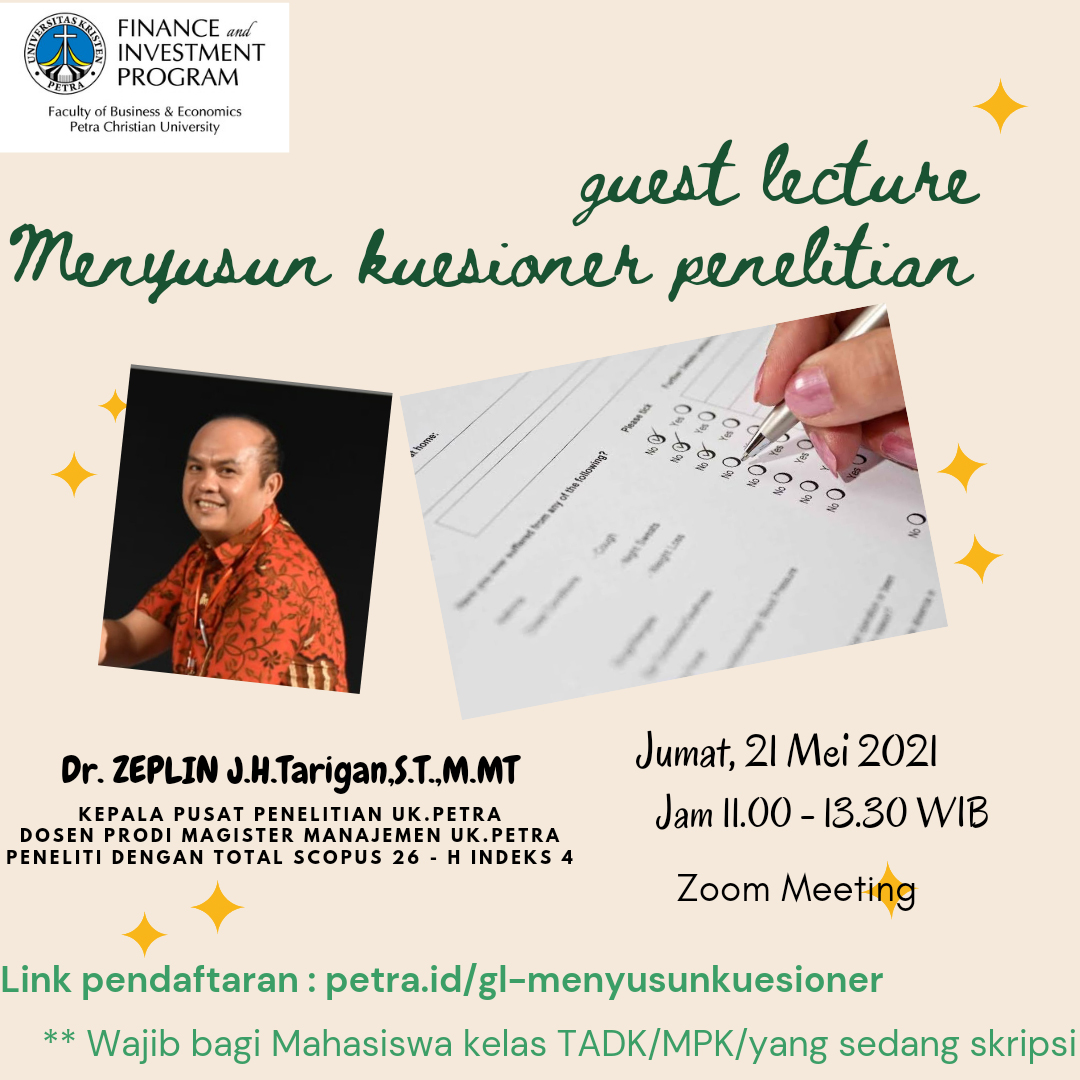 Program Manajemen Keuangan Universitas Kristen Petra Surabaya, pada tanggal 21 Mei 2021 mengadakan acara kuliah tamu dengan topik "Menyusun kuisioner penelitian". Dengan nara sumber Dr. Zeplin J.H. Tarigan S.T., M.MT. Acara ini diselenggarakan secara online dengan aplikasi Zoom Meeting.