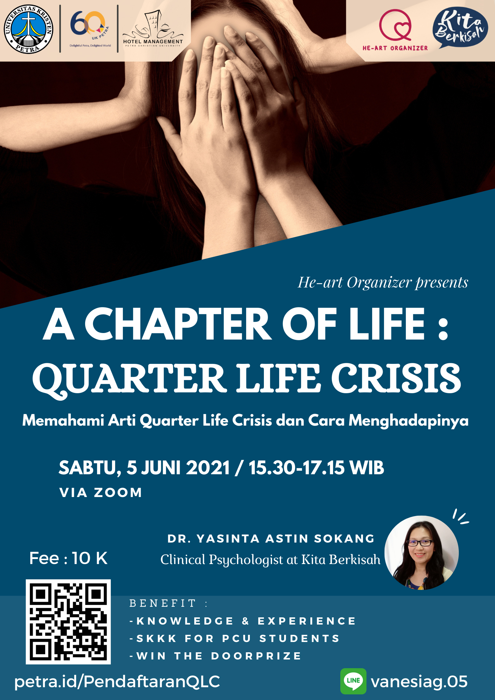 Webinar a chapter of life: quarter life crisis, akan diadakan oleh Manajemen Perhotelan UNiversitas Kristen Petra Surabaya pada tanggal 5 Juni 2021 jam 15.30 WIB. Dengan narasumber Dr. Yasinta Astin Sokang. Acara ini dapat diikuti melalui aplikasi Zoom.
