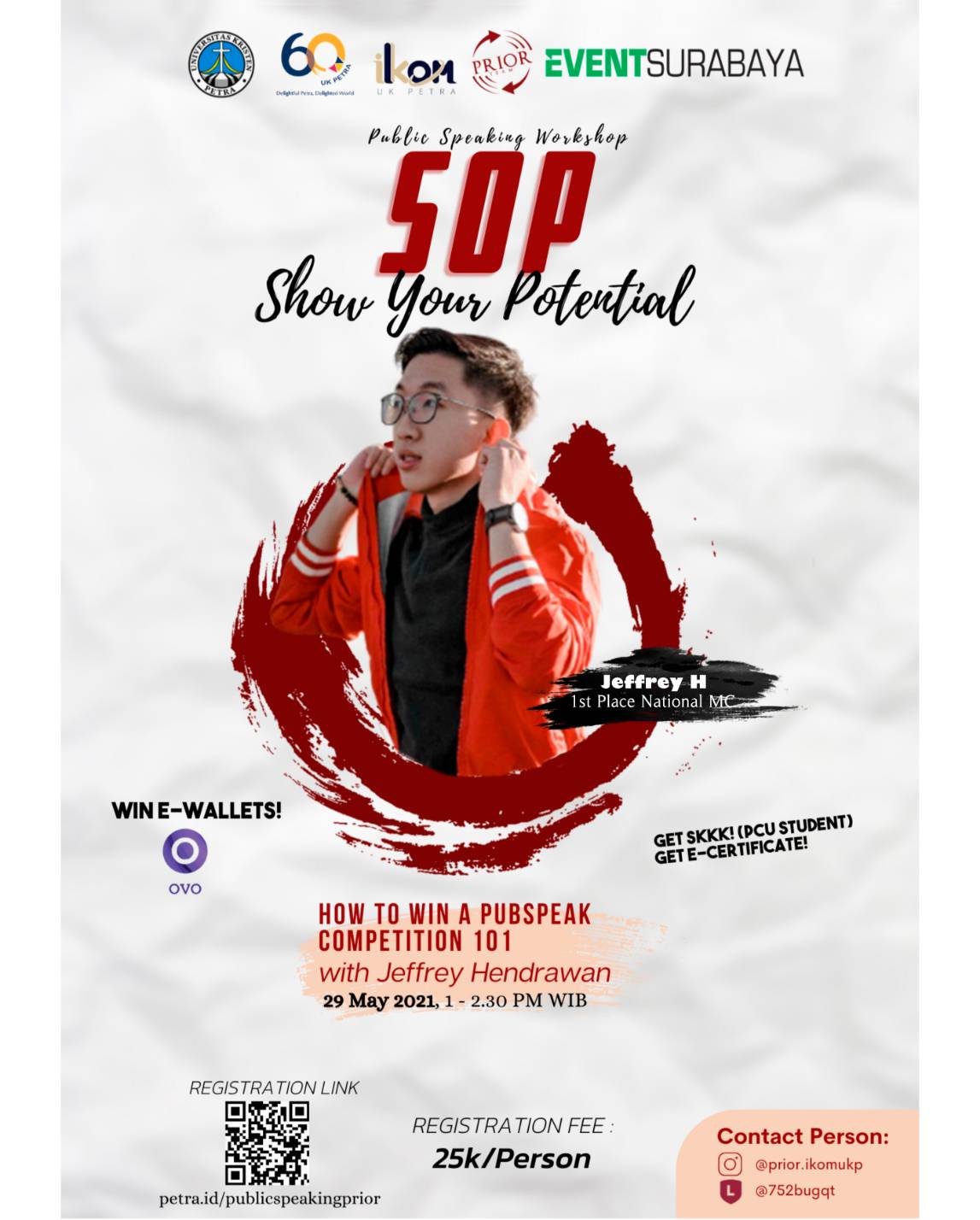 Program Studi Ilmu Komunikasi UK Petra Surabaya pada tanggal 29 Mei 2021 Jam 13.00 WIB mengadakan workshop public speaking: Show your potential. Dengan narasumber Jeffrey H. Dengan biaya pendaftaran Rp.25.000, acara ini diselenggarakan secara online.