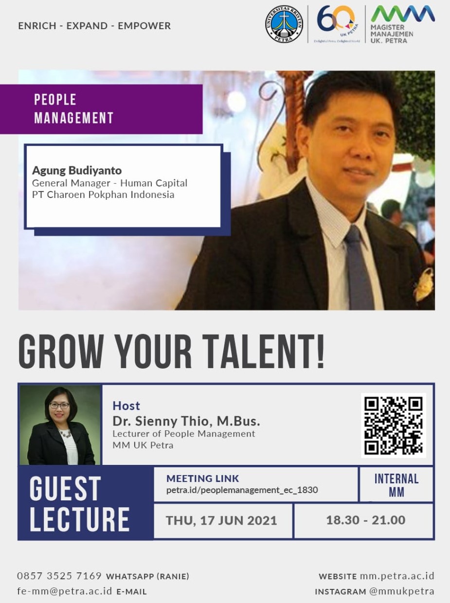 Kamis, 17 Juni 2021, jam 18.30 WIB Program Magister Manajemen UK Petra mengadakan kuliah tamu dengan topik: grow your talent. Acara ini dilaksanakan secara daring dengan narasumber Agung Budiyanto dan sebagai host Dr. Sienny Thio M.Bus.