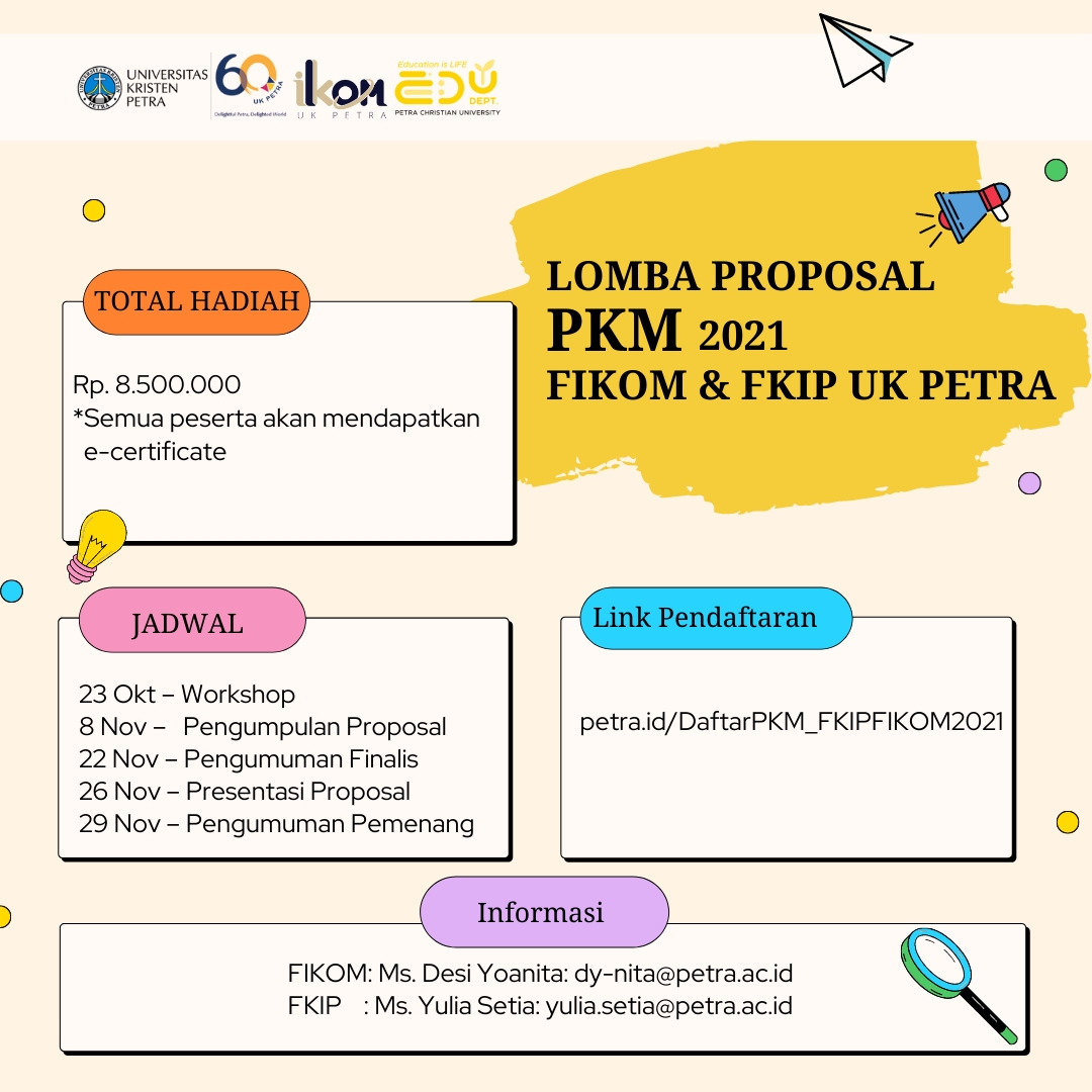 Fakultas Ilmu Komunikasi bekerjasama dengan Fakultas Keguruan dan Ilmu Pendidikan Universitas Kristen Petra Surabaya, mengadakan lomba penulisan proposal. Dengan memperebutkan total hadiah 8.5 Juta Rupiah. Untuk informasi pendaftaran ada di petra.id/DaftarPKM_FKIPFIKOM2021