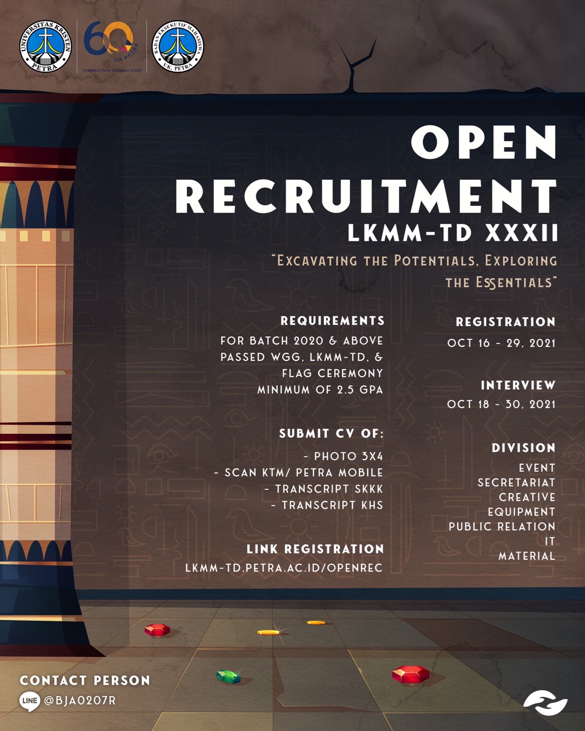 Badan Eksekutif Mahasiswa UK Petra membuka kesempatan bagi mahasiswa UK Petra untuk menjadi panitia LKMM-TD XXXII. Pendaftaran dibuka pada tanggal 16-29 Oktober 2021. Un tuk informasi ada di LKMM-TD.PETRA.AC.ID/OPENREC